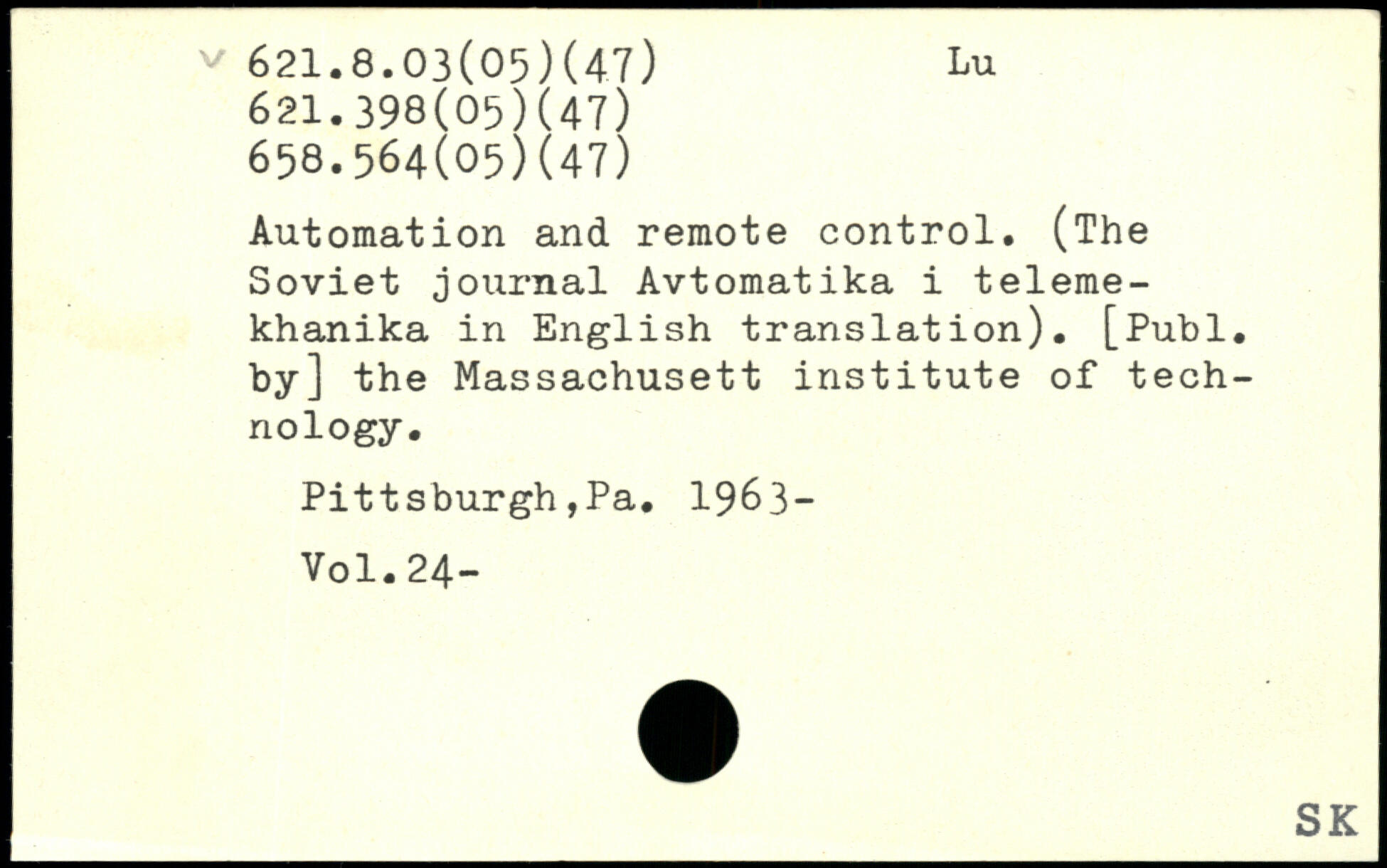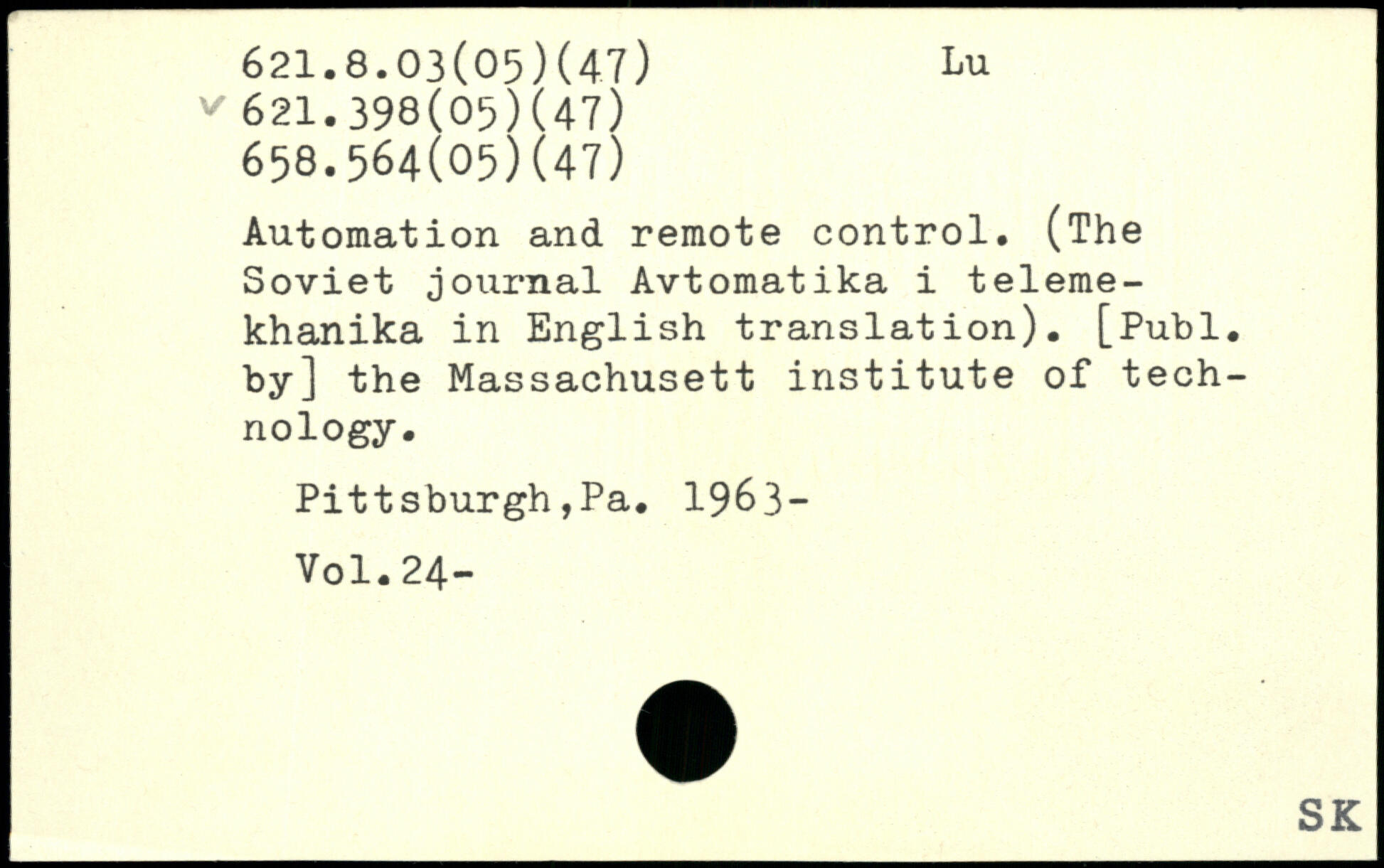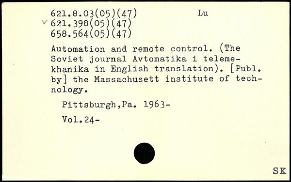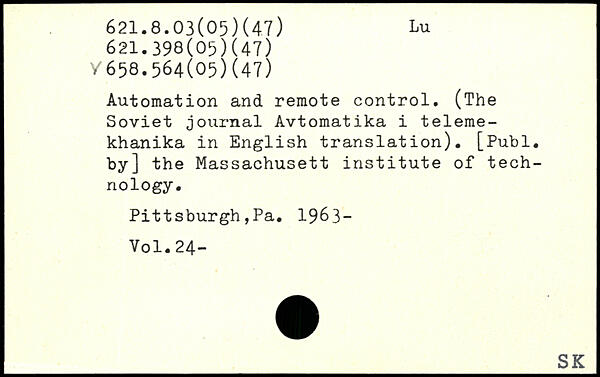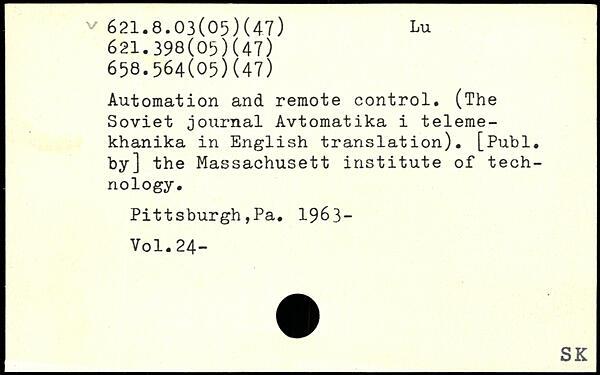 Automation and remote control. (The Soviet journal Avtomatika i teleme-khanika in English translation).