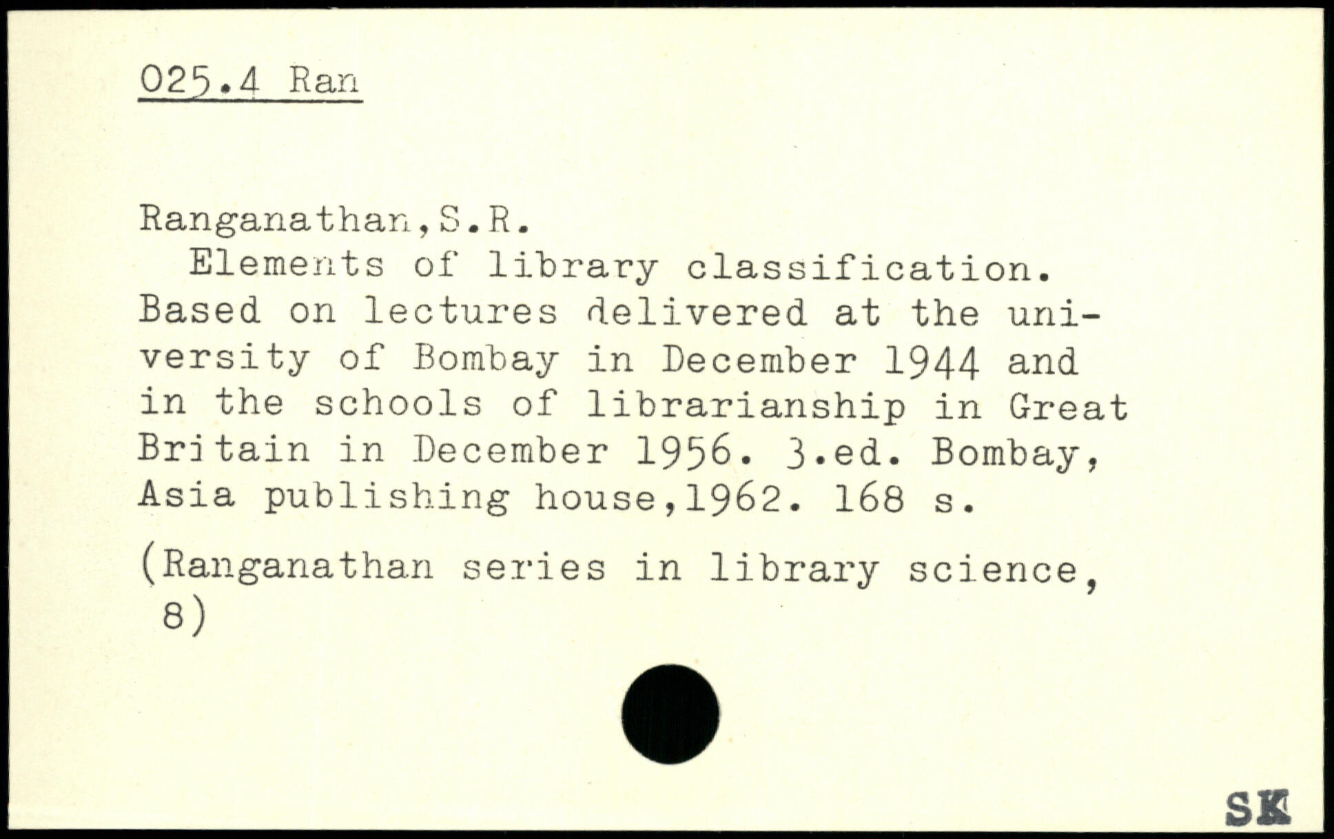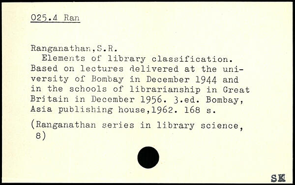 Elements of library classification. Based on lectures delivered at the university of Bombay in December 1944 and in the schools of librarianship in Great Britain in December 1956.