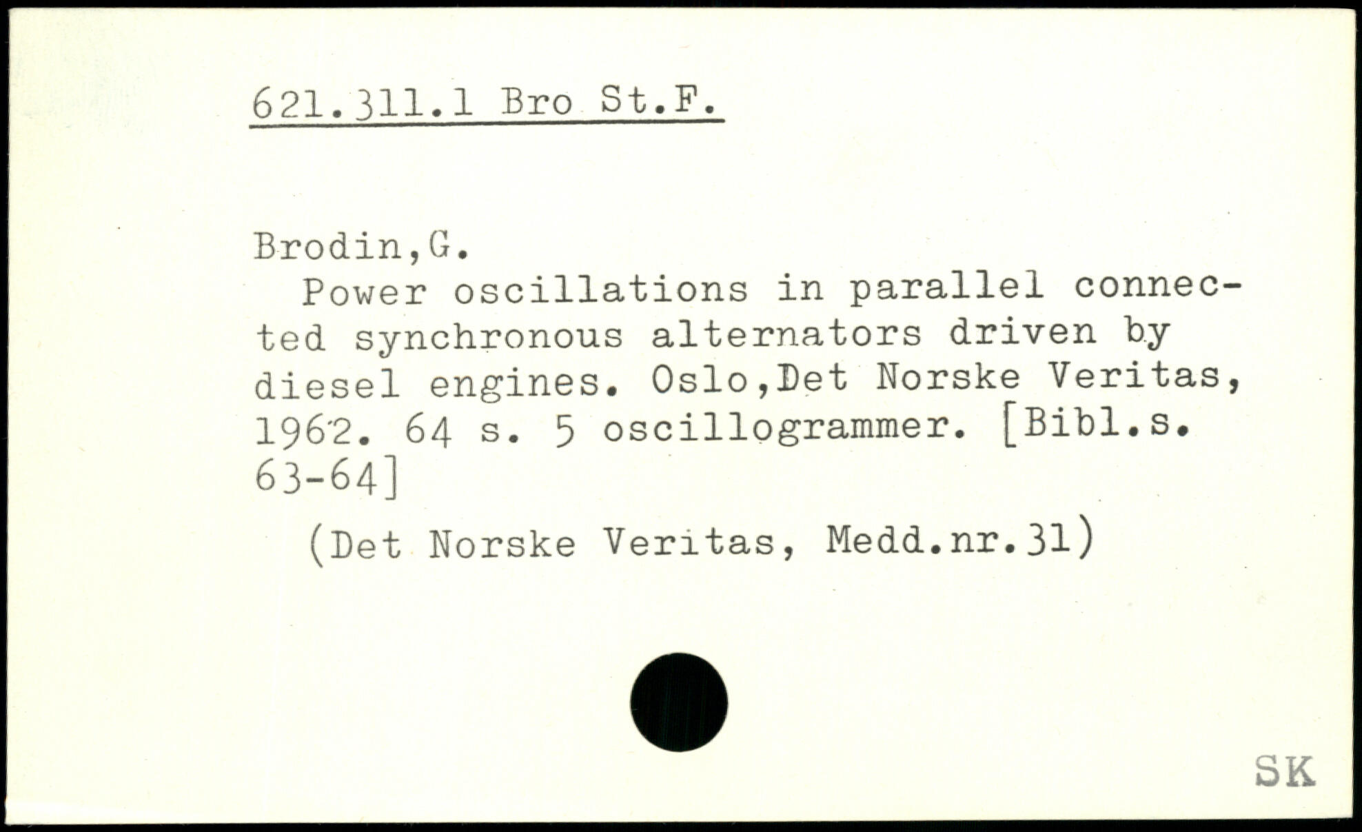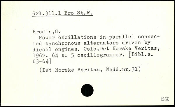 Power oscillations in parallel connected synchronous alternators driven by diesel engines. Oslo,Bet Norske Veritas, 196'2.