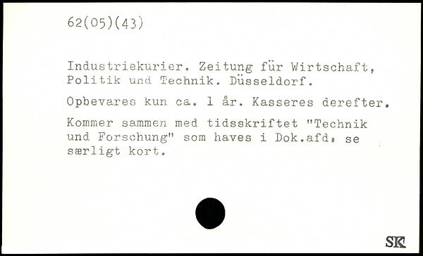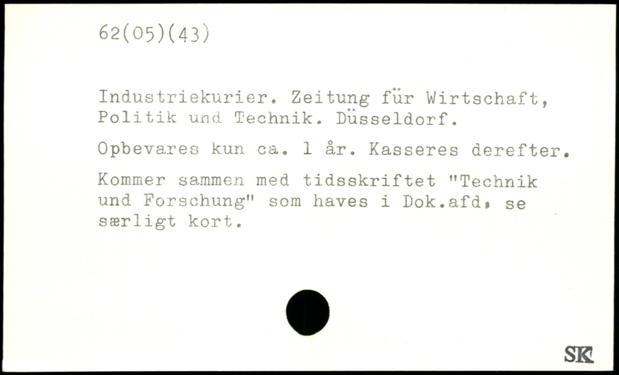 Industriekurier. Zeitung für Wirtschaft, Politik und Technik. Düsseldorf. Opbevares kun ca. 1 år. Kasseres derefter. Kommer sammen med tidsskriftet "Technik und Forschung" som haves i Dok.afd. se særligt kort.