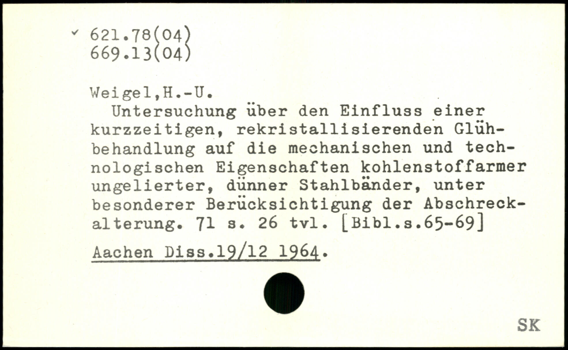 Untersuchung über den Einfluss einer kurzzeitigen, rekristallisierenden Glühbehandlung auf die mechanischen und technologischen Eigenschaften kohlenstoffarmer ungelierter, dünner Stahlbänder, unter besonderer Berücksichtigung der Abschreckalterung. 71 3. 26 tvl.