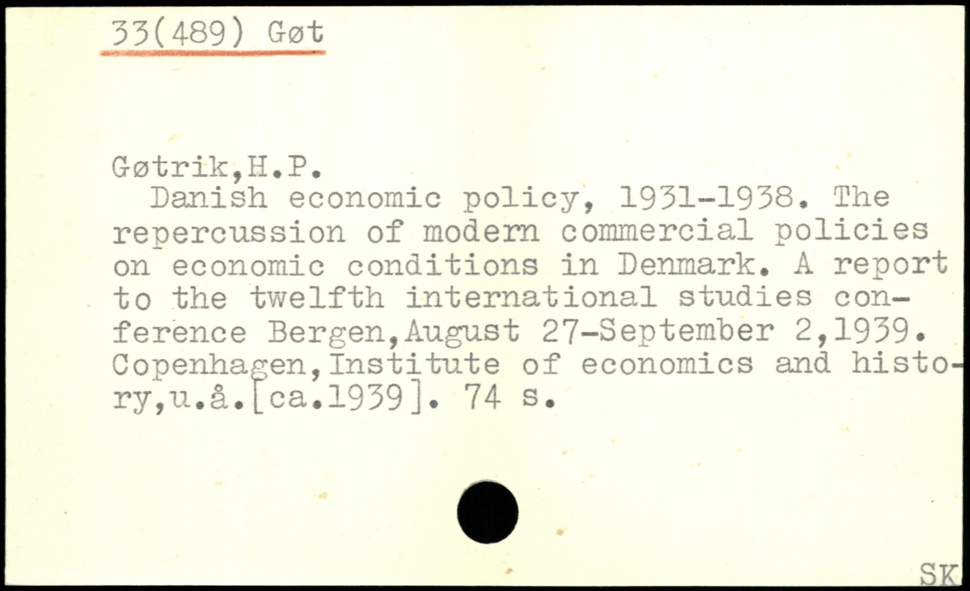 Danish economic policy, 1931-1938. The repercussion of modem commercial policies on economic conditions in Denmark. A report to the twelfth international studies conference Bergen,August 27-Septemher 2,1939. Copenhagen,Institute of economics and history, u.a.[ca. 1939]. 74- s.