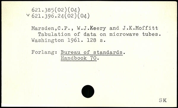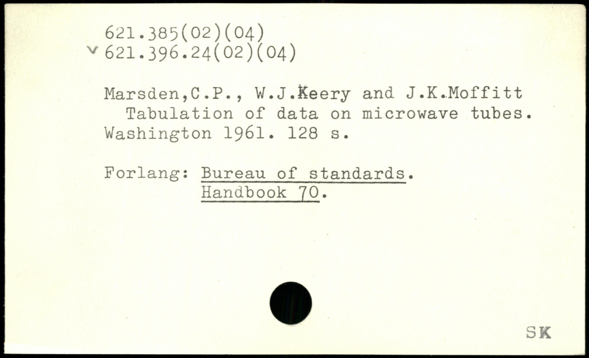 Marsden,C.P., W.J.&eery and J.K.Moffitt Tabulation of data on microwave tubes.