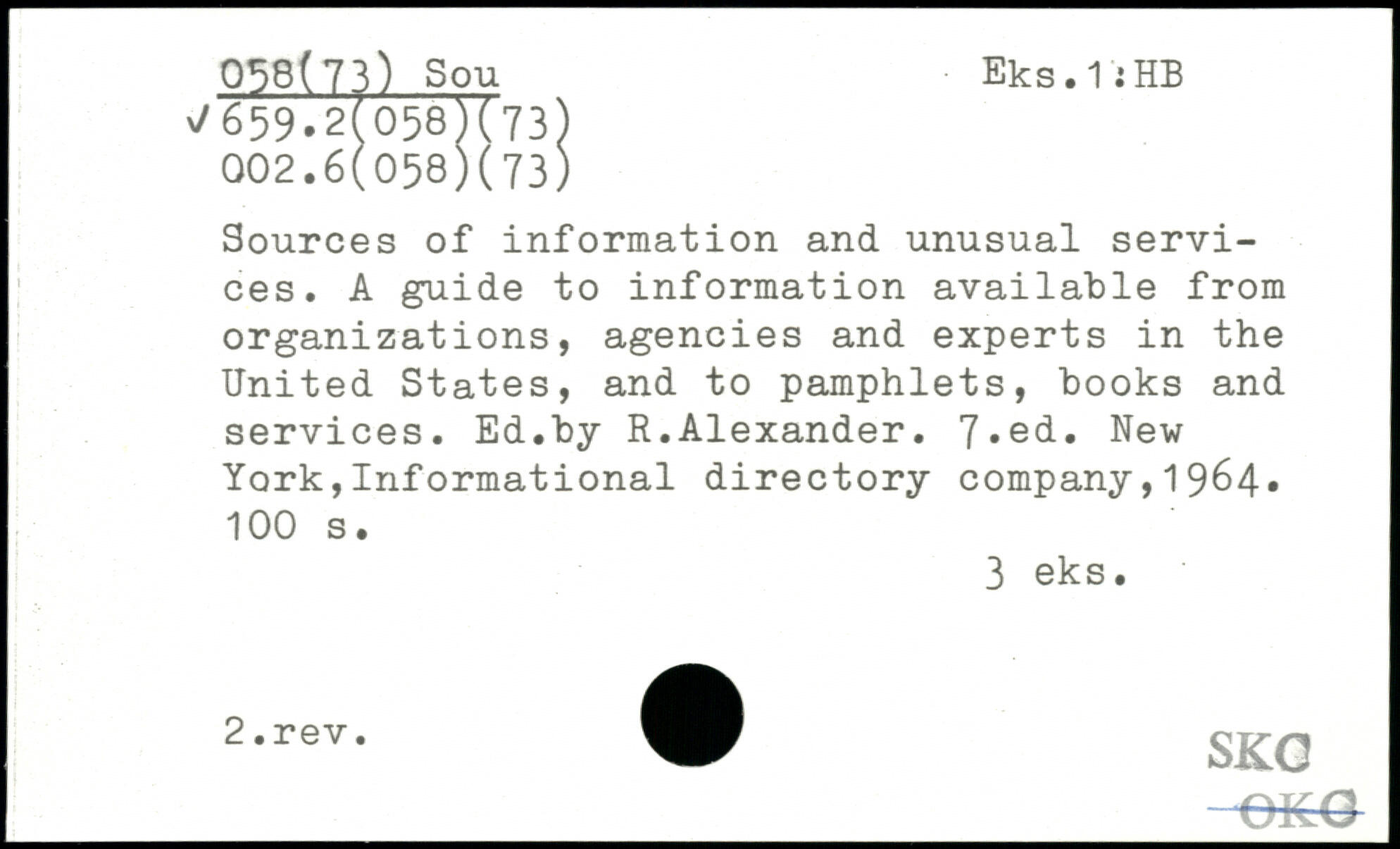 Sources of information and unusual services. A guide to information available from organizations, agencies and experts in the United States, and to pamphlets, books and services. Ed.by R.Alexander, ^.ed