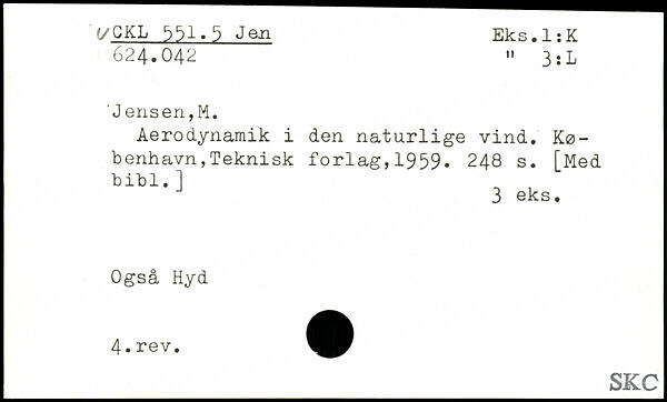 t/CKL bbl. 5 Jen Eks.lsK 624.042 , 3; L 'J ensen,M. Aerodynamik i den naturlige vind.