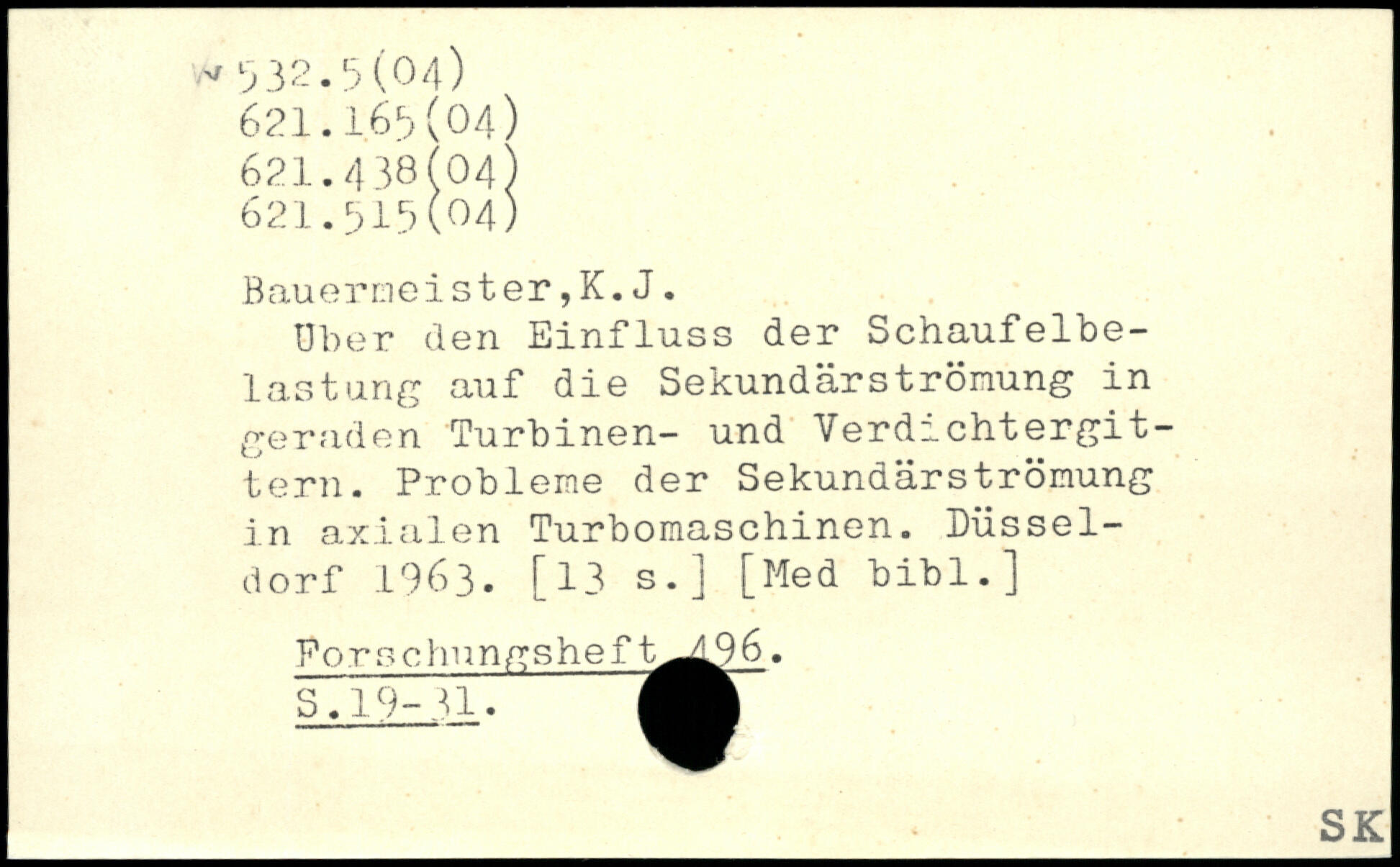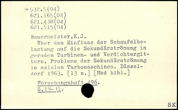 Uber den Einfluss der Schaufelbelastung auf die Sekundärströmung in geraden Turbinen- und Verdichtergittern. Probleme der Sekundärströmung in axialen Turbomaschinen. Düsseldorf 1963. [l