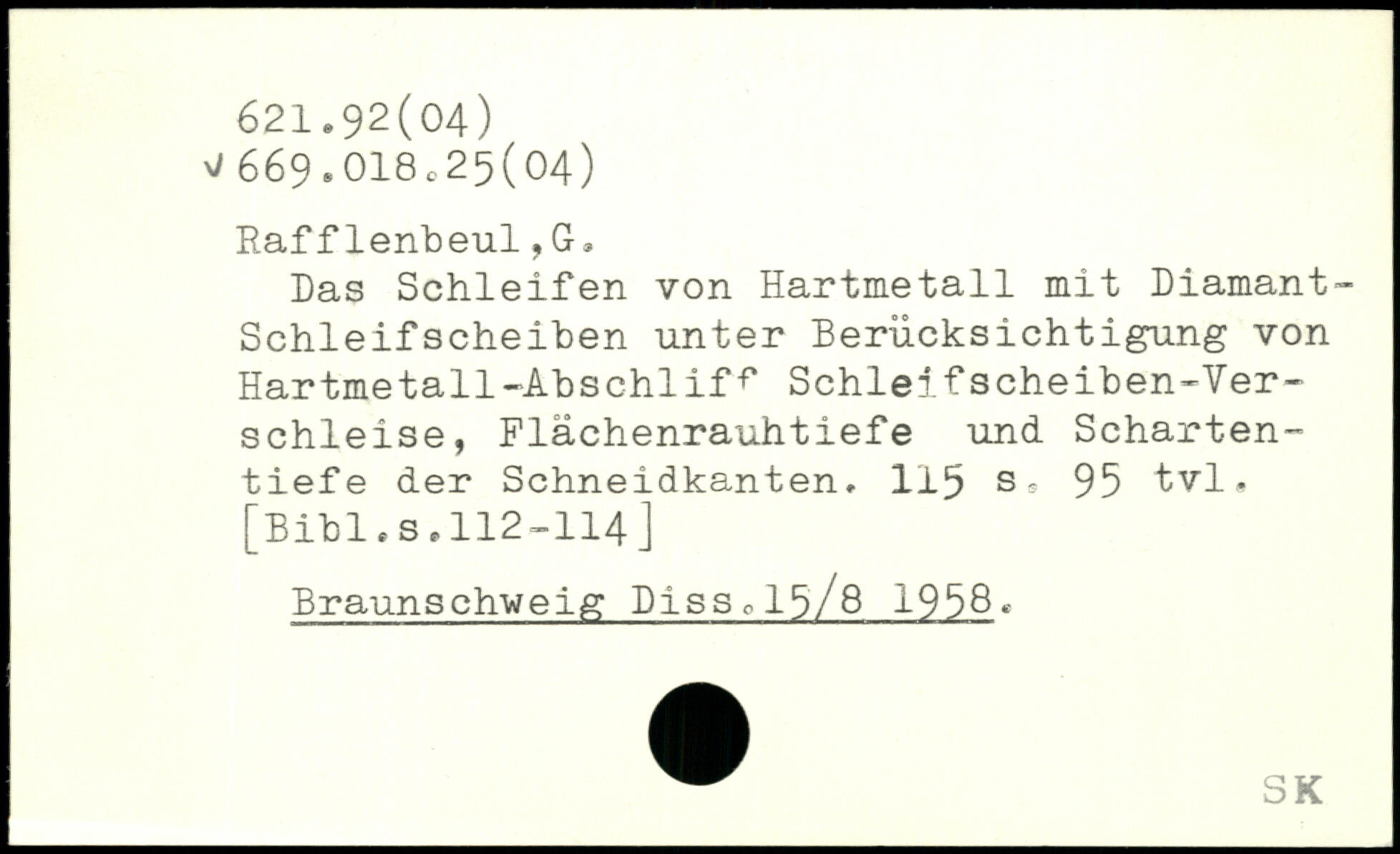 Das Schleifen von Hartmetall mit Diamant-Schleifscheiben unter Berücksichtigung von Hartmetall-Abschiifr Schleifscheiben-Ver-schieise, Flächenrauhtiefe und Schartentiefe der Schneidkanten. 115 95 tvl.