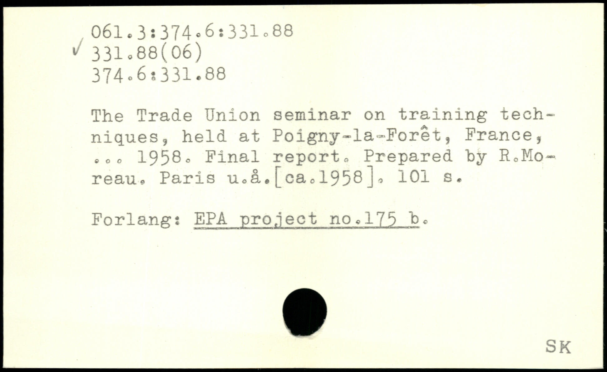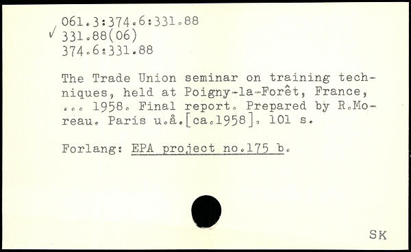 The Trade Union seminar on training techniques, held at Poigny-la-Foret, France, eoo 1958o Final report, Prepared hy RcMo-reau. Paris uca.[ca01958j.