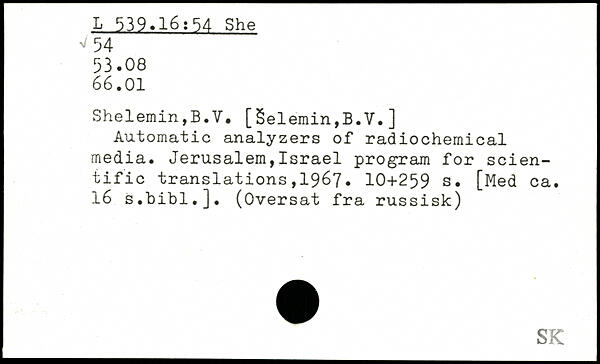 Shelemin,B.V. [Selemin,B.V.] Automatic analyzers of radiochemical media. Jerusalem,Israel program for scientific translations,1967.