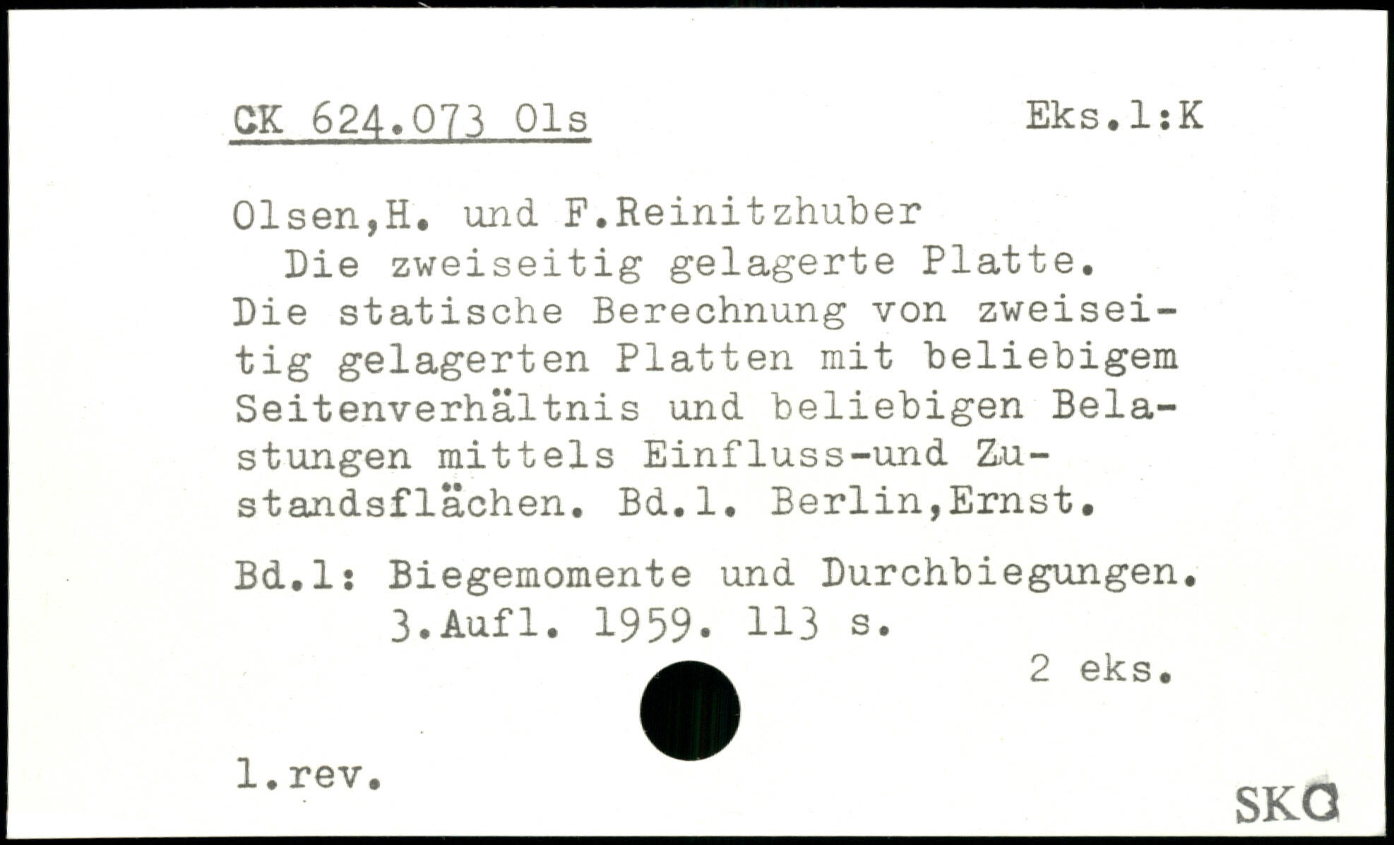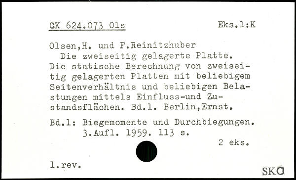Die zweiseitig gelagerte Platte. Die statische Berechnung von zweiseitig gelagerten Platten mit heliehigem Seitenverhältnis und beliebigen Belastungen mittels Einfluss-und Zustandsflächen. Bd.l. Berlin,Ernst. Bd.l: Biegemomente und Durchbiegungen.