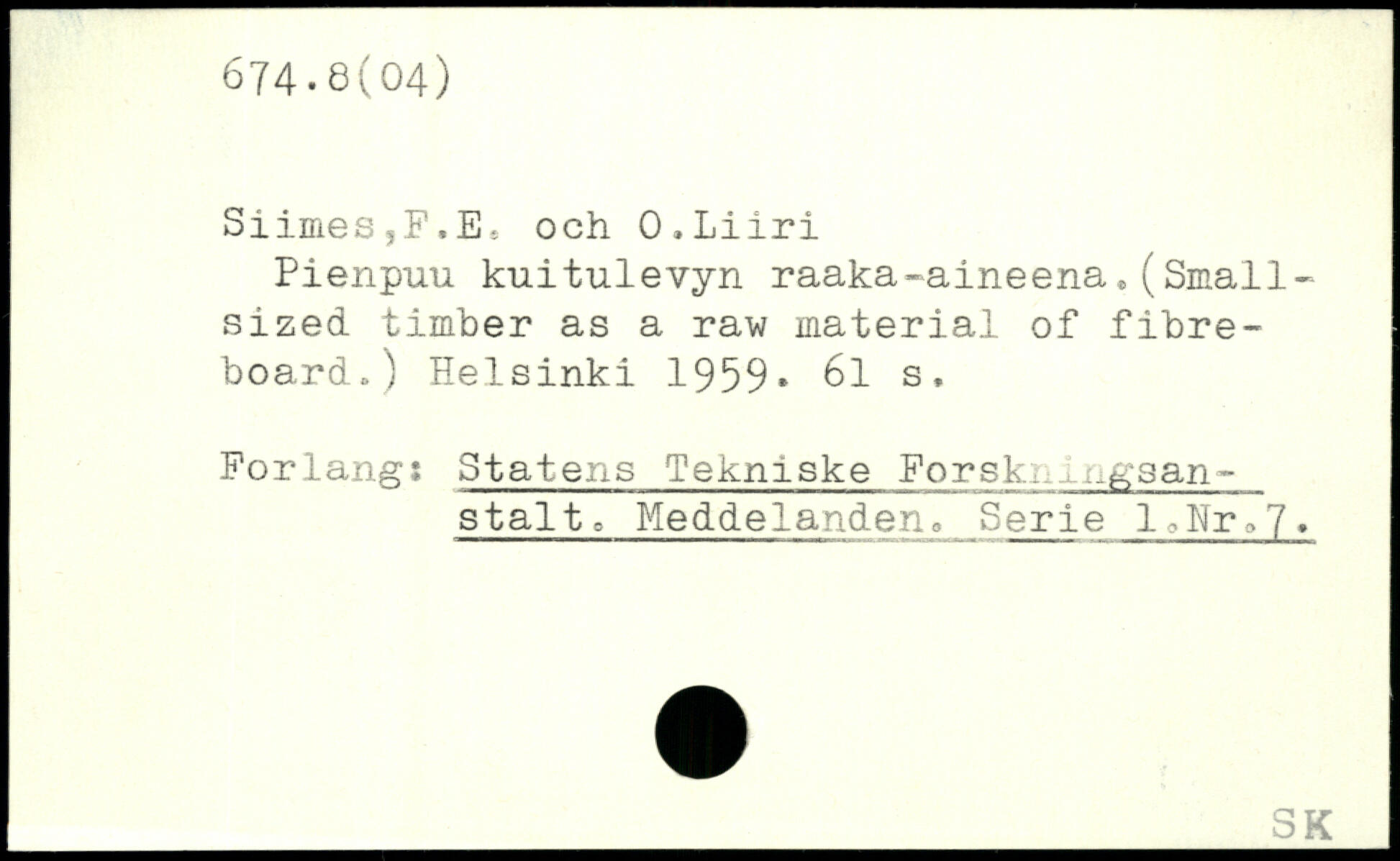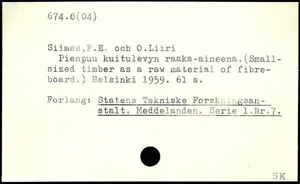 Siimes,F,Ee och O.Liiri Pienpuu kuitulevyn raaka-aineena.(Small-sized timber as a raw material of fibre-board.)