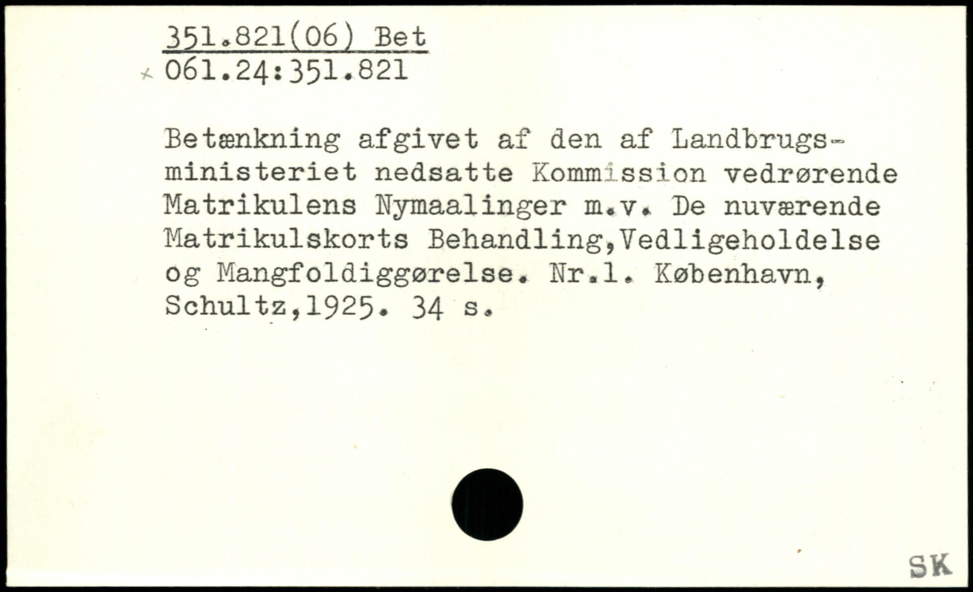 Betænkning afgivet af den af Landbrugsministeriet nedsatte Kommission vedrørende Matrikulens Nymaalinger m.v. De nuværende Matrikulskorts Behandling,Vedligeholdelse og Mangfoldiggørelse. Nr.l.