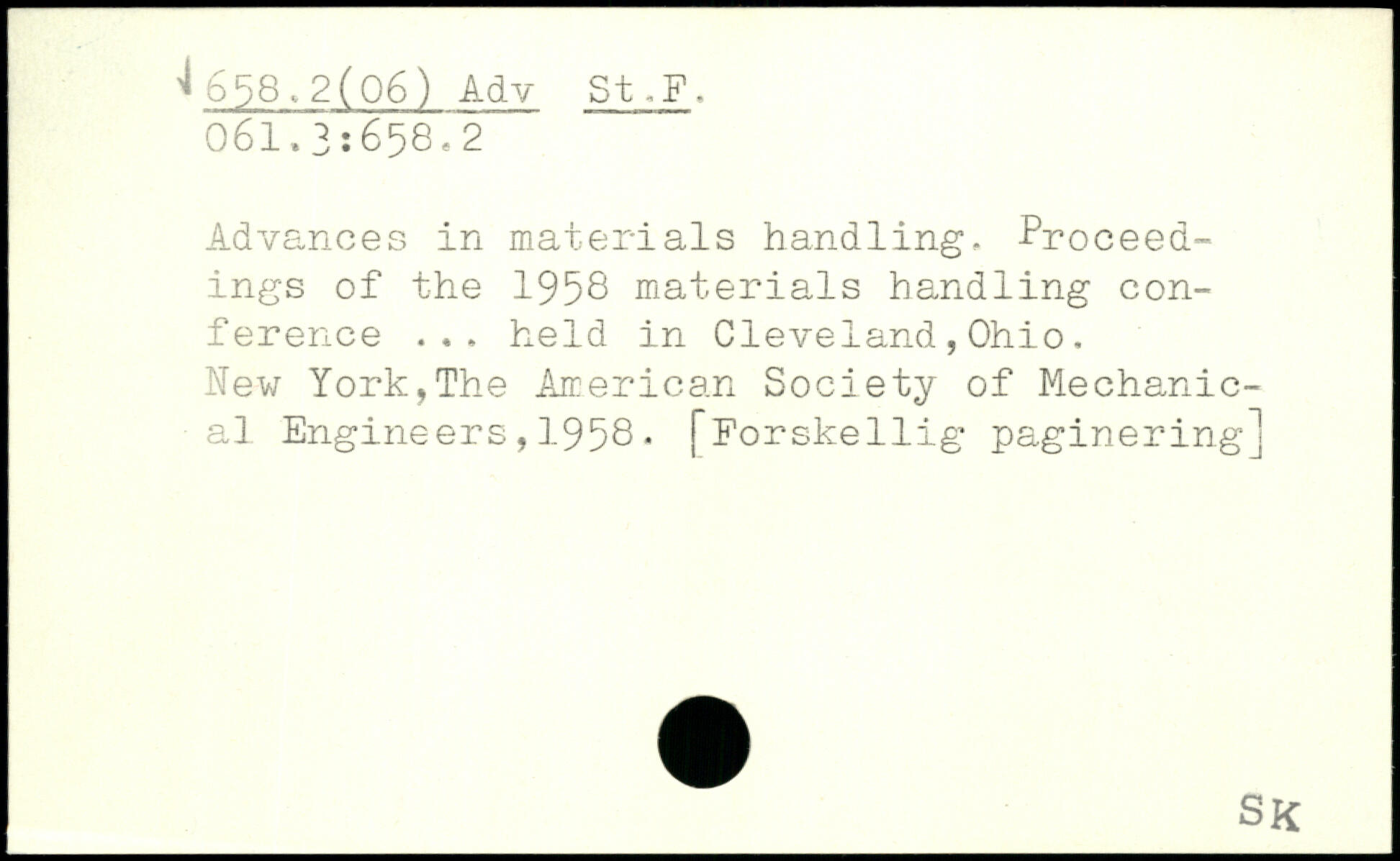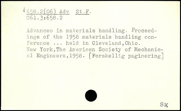 Advances in materials handling, Proceedings of the 1956 materials handling conference ... held in Cleveland,Ohio. New York,The American Society of Mechanical Engineers,1958. [Forskellig paginering]