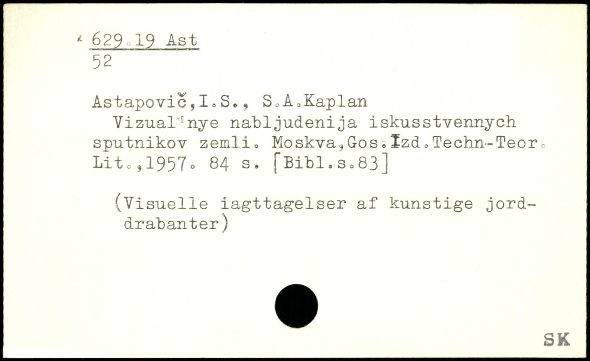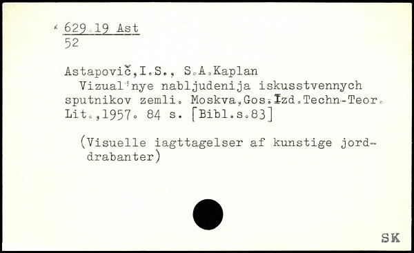 Astapovic,I c S., S0A0Kaplan Vizualsnye nabljudenija iskusstvennych sputnikov zemlio Moskva,GossIzd,,Techn-Teor. Lite,1957o