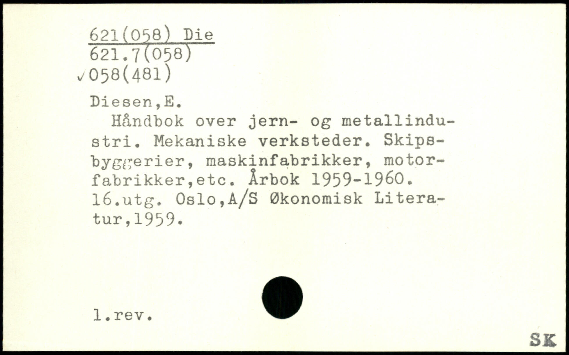 Håndbok over jern- og metallindustri. Mekaniske verksteder. Skips-byggerier, maskinfabrikker, motorfabrikker ,etc. Årbok 1959-1960. 16.utg. Oslo,A/S Økonomisk Literatur ,1959. _SX_