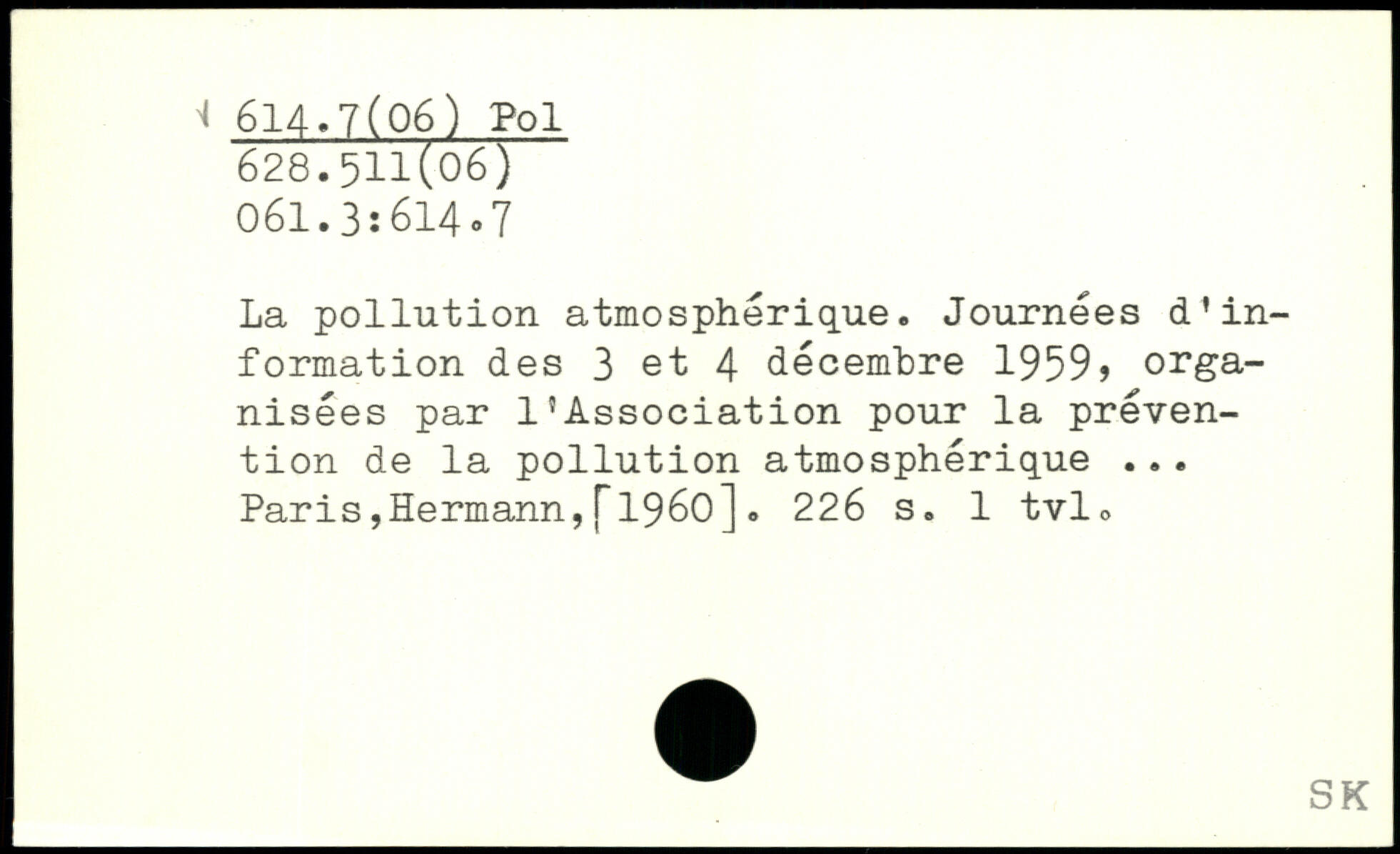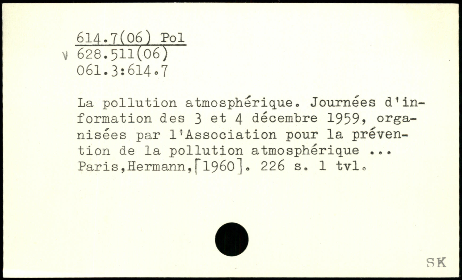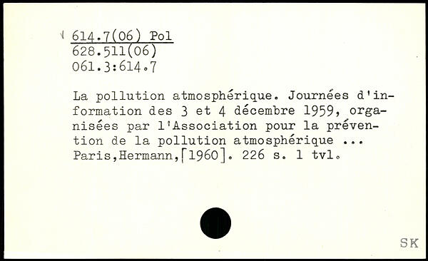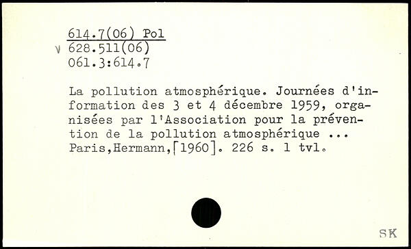 La pollution atmosphérique. Journées d'information des 3 et 4 décembre 1959> organisées par l'Association pour la prévention de la pollution atmosphérique ... Paris,Hermann,f1960].
