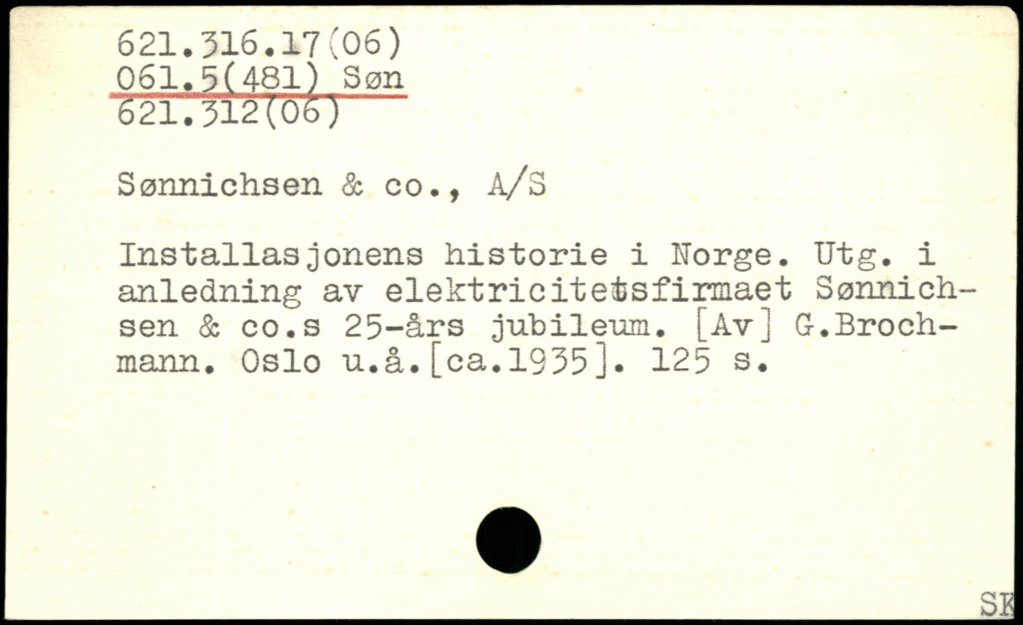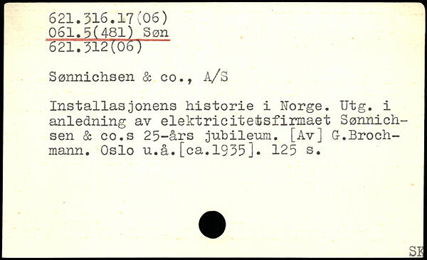 Sannichsen & oo., A/S Installasjonens historié i Norge. Utg. i anledning av elektricite&sfirmaet Sonnich-sen & co.s 25-ârs jubilemn. [Av] G.Broch-mann. Oslo u.â.[ca.1935].