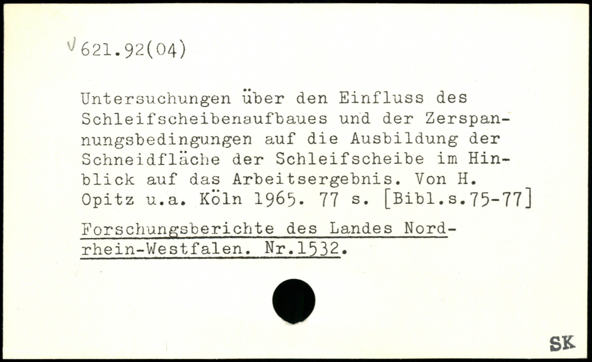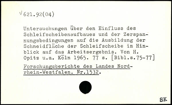 Untersuchungen üher den Einfluss des Schleifscheibenaufbaues und der Zerspan-nungsbedingungen auf die Ausbildung der Schneidfläche der Schleifscheibe im Hinblick auf das Arbeitsergebnis. Von H. Opitz u.a.