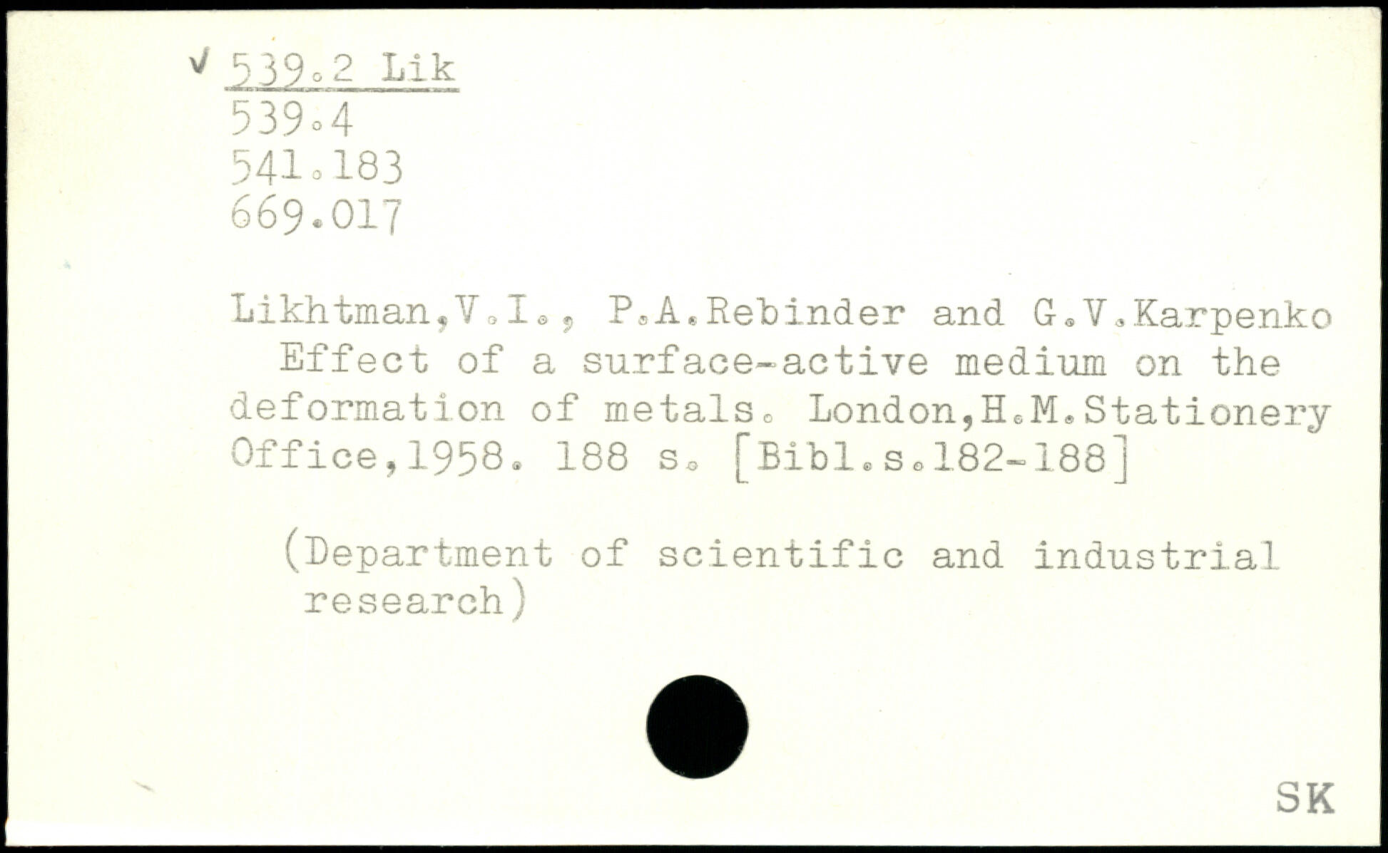 Likhtman,V0I8s P.A.Reminder and G,Y.Karpenko Effect of a surface-active medium on the deformation of metals. London,H6M,Stationery Office,1958.