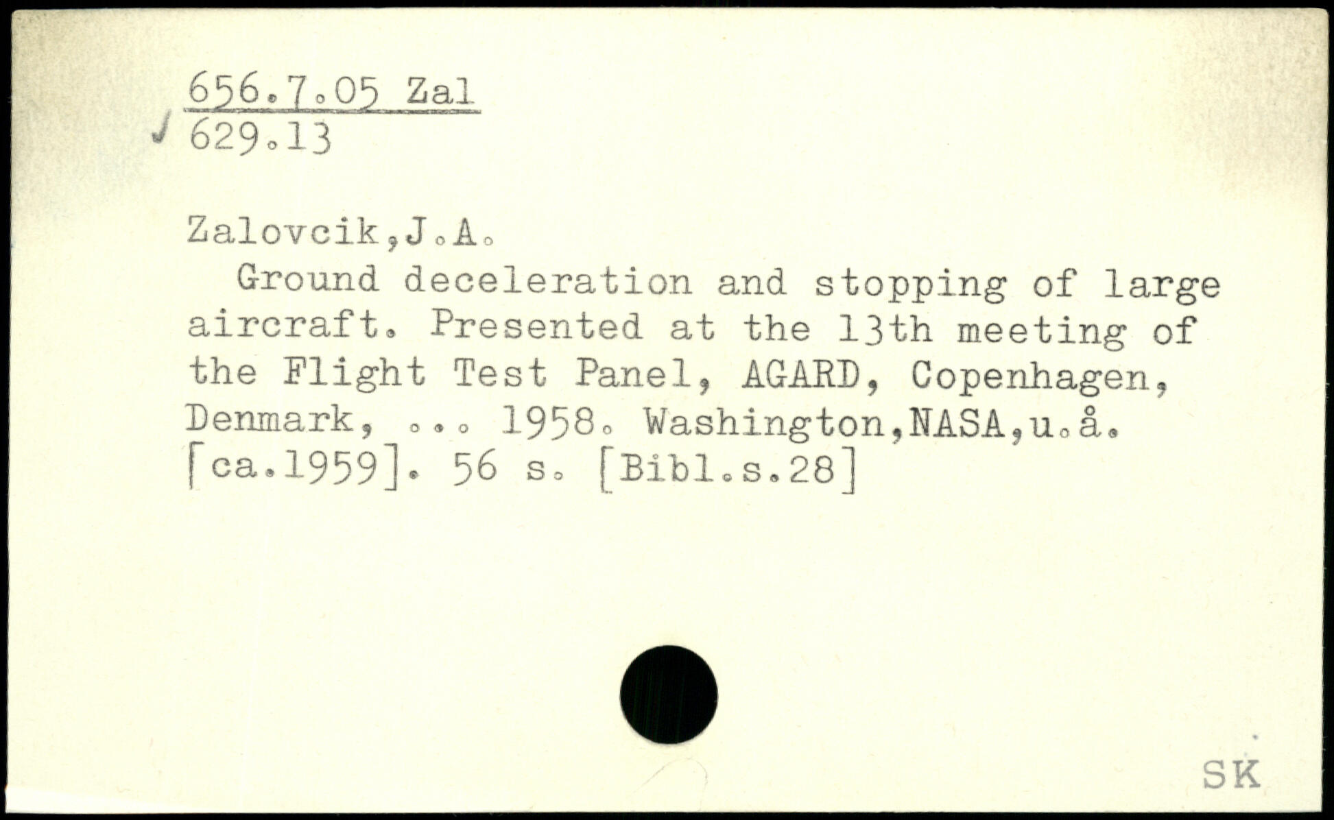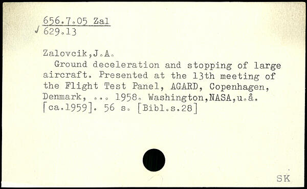 Zalovcik ?JoA. Ground deceleration and stopping of large aircraft. Presented at the 13th meeting of the Flight Test Panel, AGARD, Copenhagen, Denmark, ... 1958, Washington,NASA,u0a, |"ca.1959].