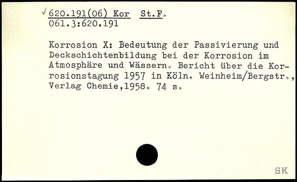 Korrosion X: Bedeutung der Passivierung und Deckschichtenbildung bei der Korrosion im Atmosphäre und Wässerno Bericht über die Korrosionstagung 1957 in Köln. Weinheim/Bergstr0, Verlag Chemie,1958o