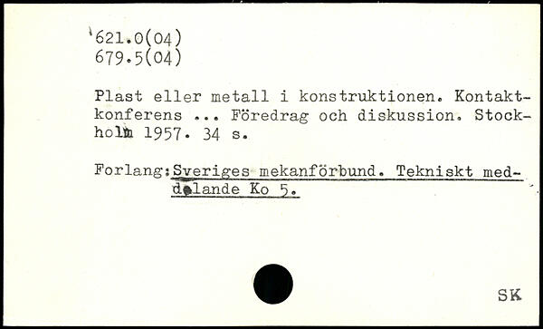 Plast eller metall i konstruktionen. Kontaktkonferens ... Föredrag och diskussion. Stock-holfc 1957.