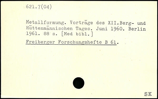 Metallformung. Vorträge des XII.Berg- und Hüttenmännischen Tages. Juni 1960.