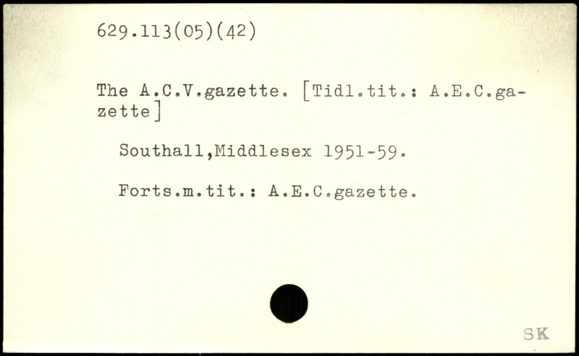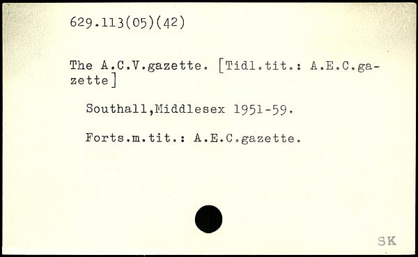The A.C.V,gazette. [Tidl.tit.: A.E.C.gazette ] Southall,Middlesex 1951-59. Forts.m.tit.î A.E.C.gazette.