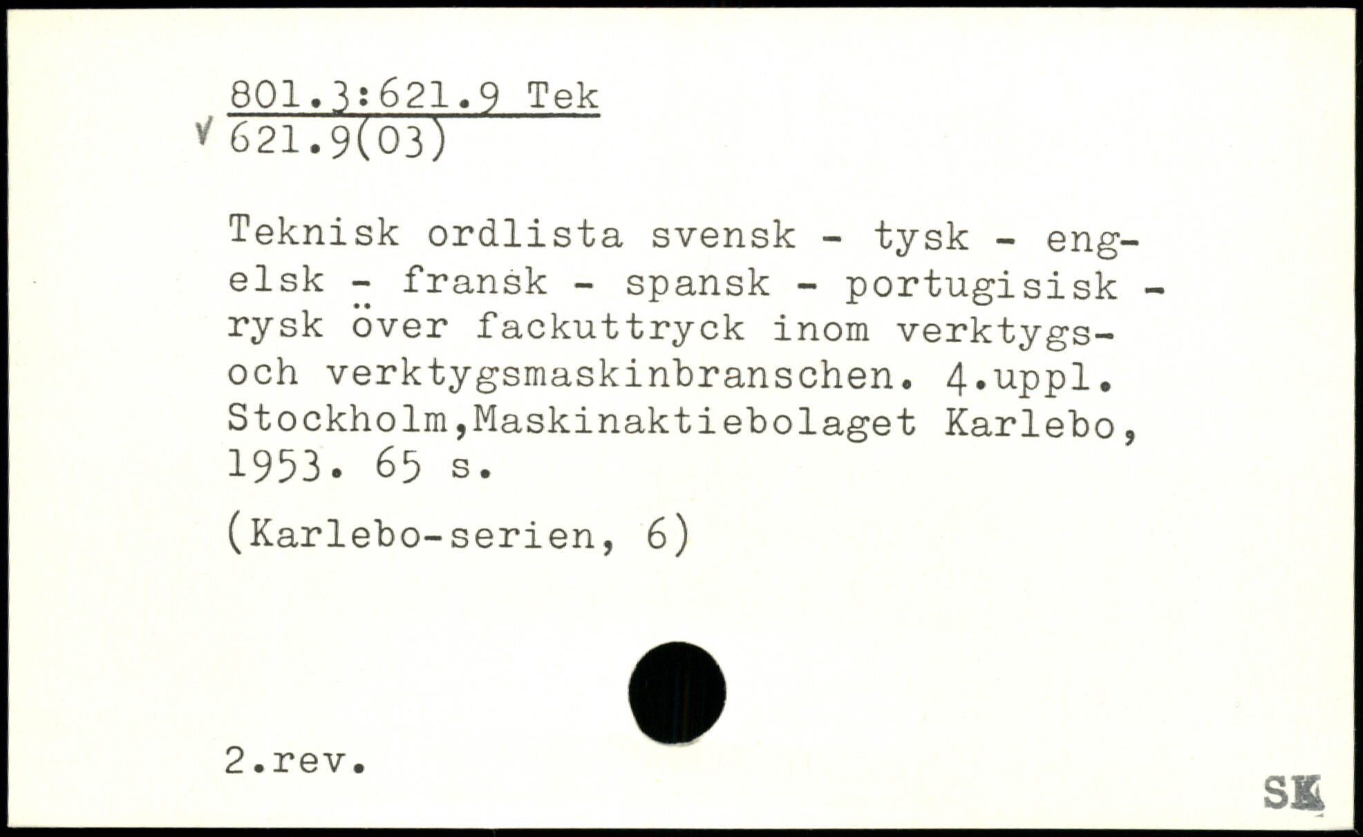 Teknisk ordlista svensk - tysk - engelsk - fransk - spansk - portugisisk -rysk över fackuttryck inom verktygs-och verktygsmaskinbranschen.