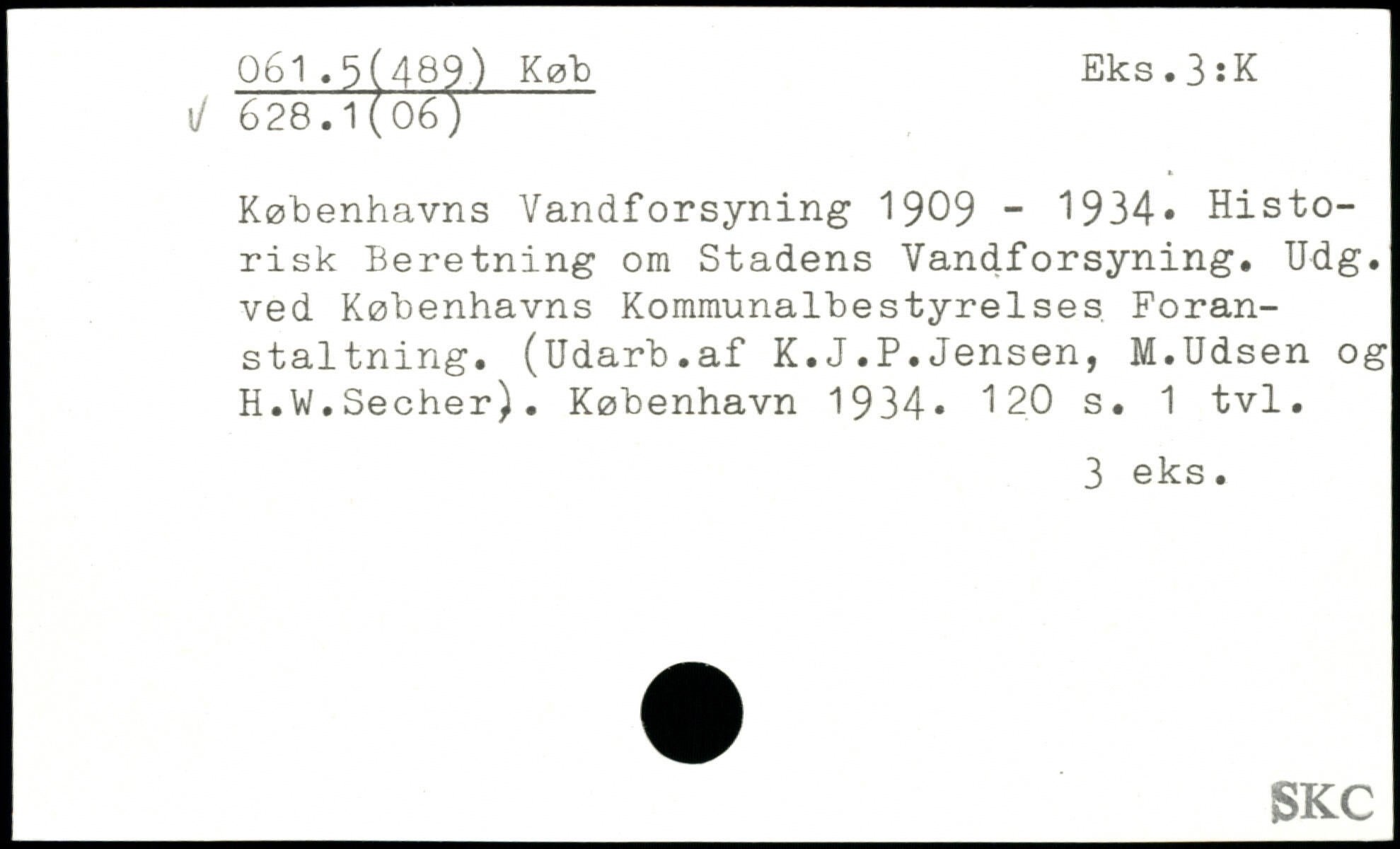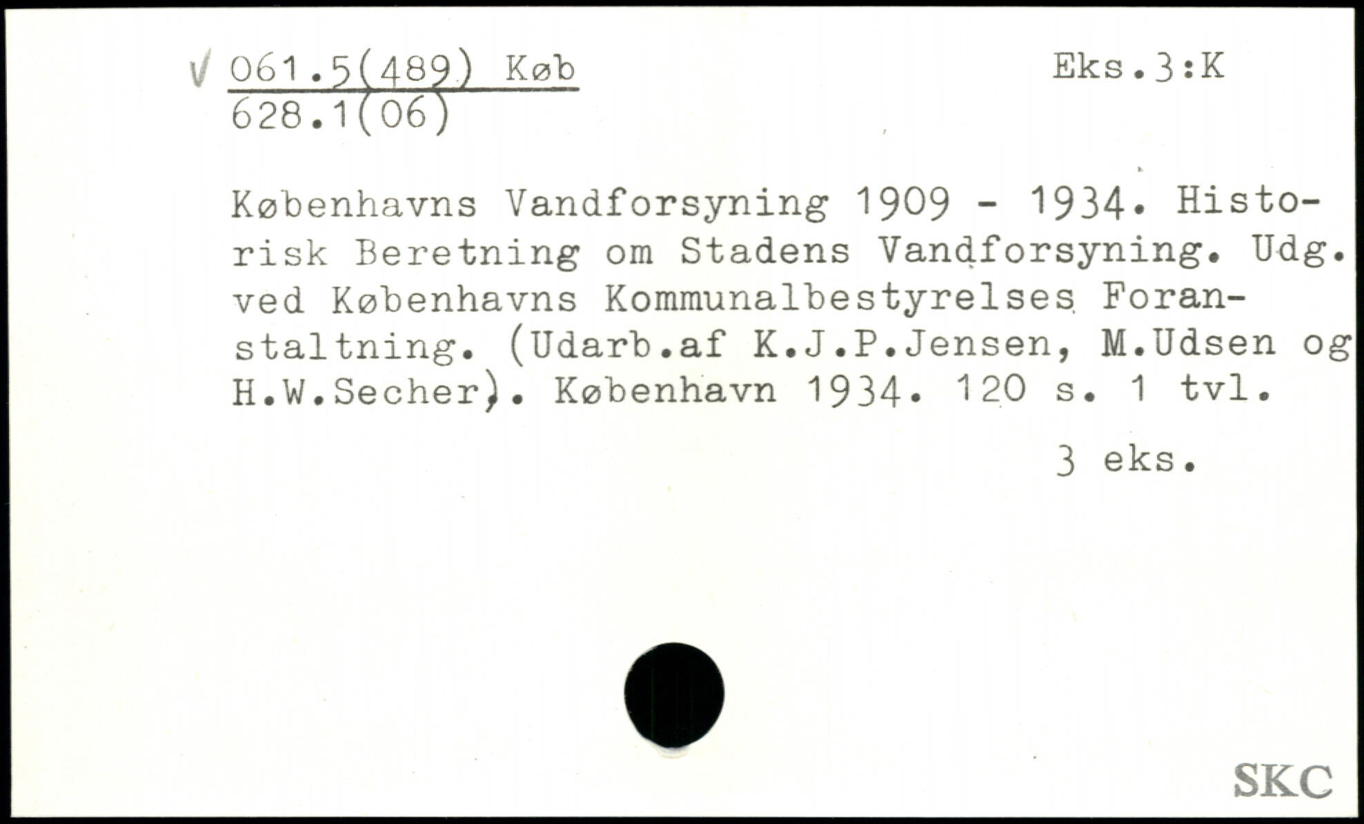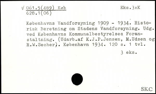 Københavns Vandforsyning 1909 - 1934, Historisk Beretning om Stadens Vandforsyning. Udg. ved Københavns Kommunalbestyrelses Foranstaltning. (Udarb.af K.J.P.Jensen, M.Udsen og H.W.Secher).