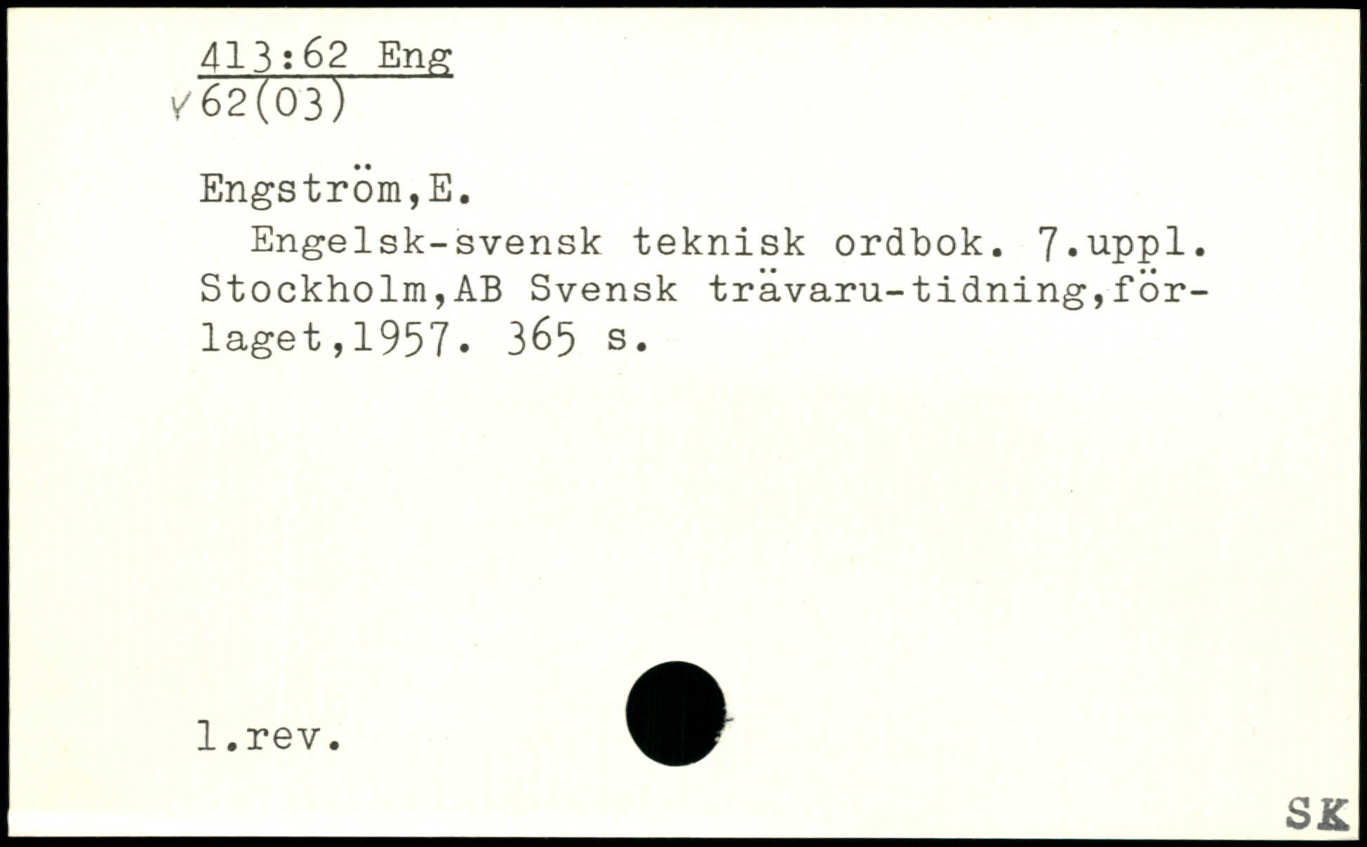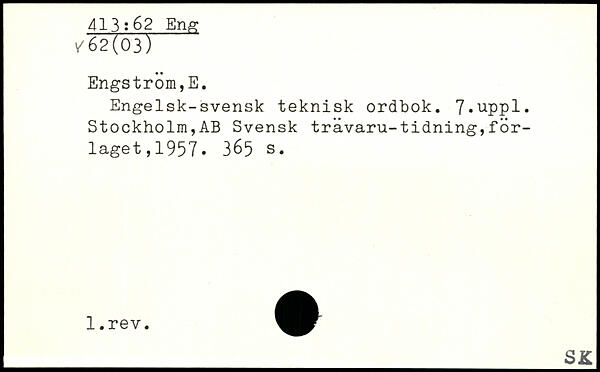 Engelsk-svensk teknisk ordbok. 7,uppl. Stockholm,AB Svensk travaru-tidning,for- laget,1957.
