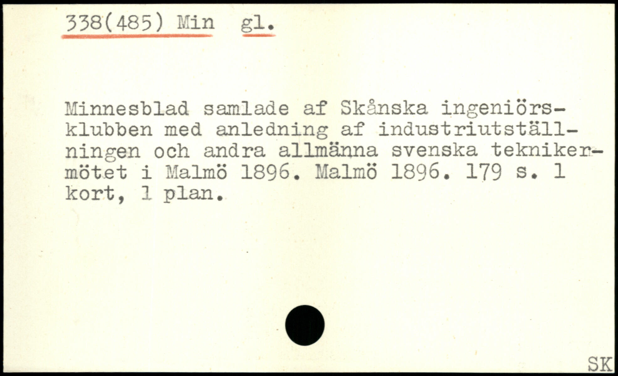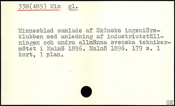 Minnesblad samlade af Skånska ingeniörs-klubben med anledning af industriutställningen och andra allmänna svenska teknikermötet i Malmö 1896. Malmö 1896.