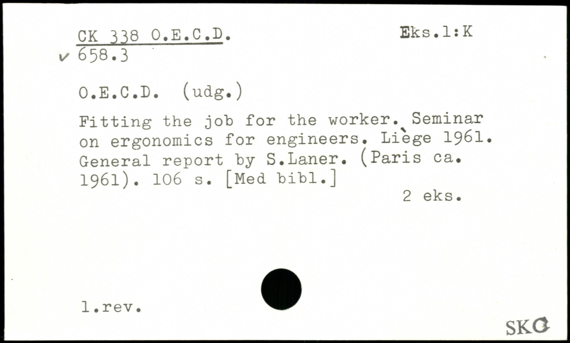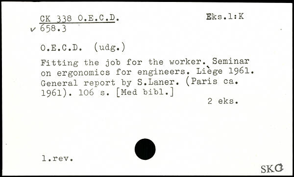 Fitting the job for the worker.^Seminar on ergonomics for engineers. Liege 1961. General report by S.Laner. (Paris ca. 1961).