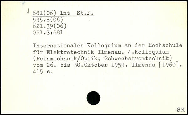 Internationales Kolloquium an der Hochschule für Elektrotechnik Ilmenau. 4,Kolloquium (Fe inmechanik/Optik, Schwachstromtechnik) I vom 26. bis 30.Oktober 1959. Ilmenau [1960].