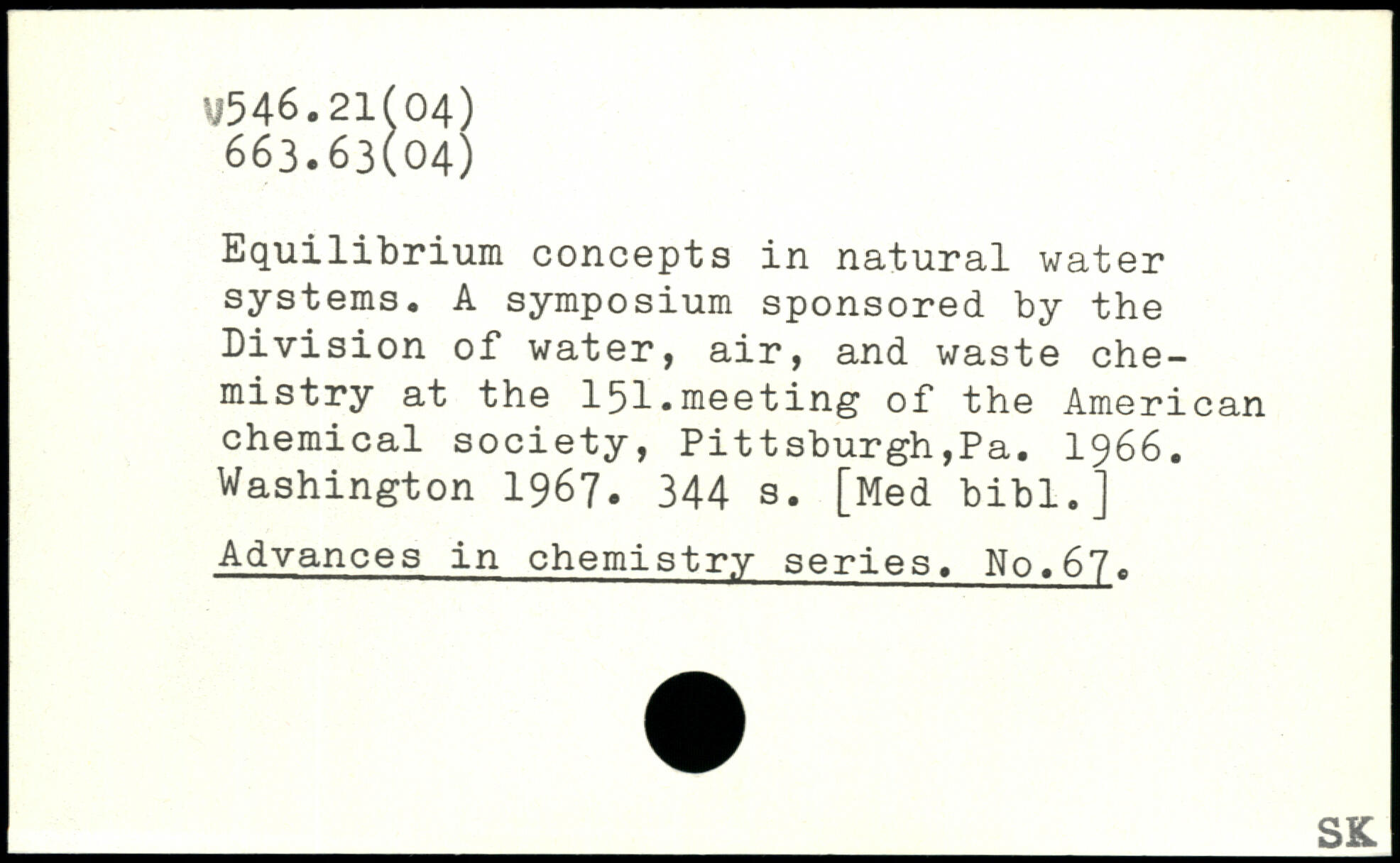 Equilibrium concepts in natural water systems. A symposium sponsored by the Division of water, air, and waste chemistry at the 151.meeting of the American chemical society, Pittsburgh,Pa. 1966.
