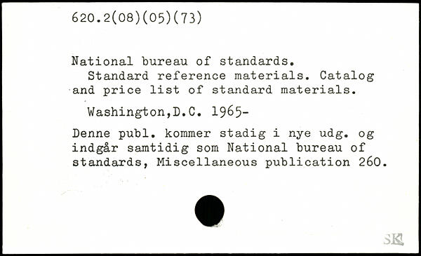 National bureau of standards. Standard reference materials. Catalog and price list of standard materials. Washington,D.C. 1965- Denne publ. kommer stadig i nye udg. og indgår samtidig som National bureau of standards, Miscellaneous publication 260.