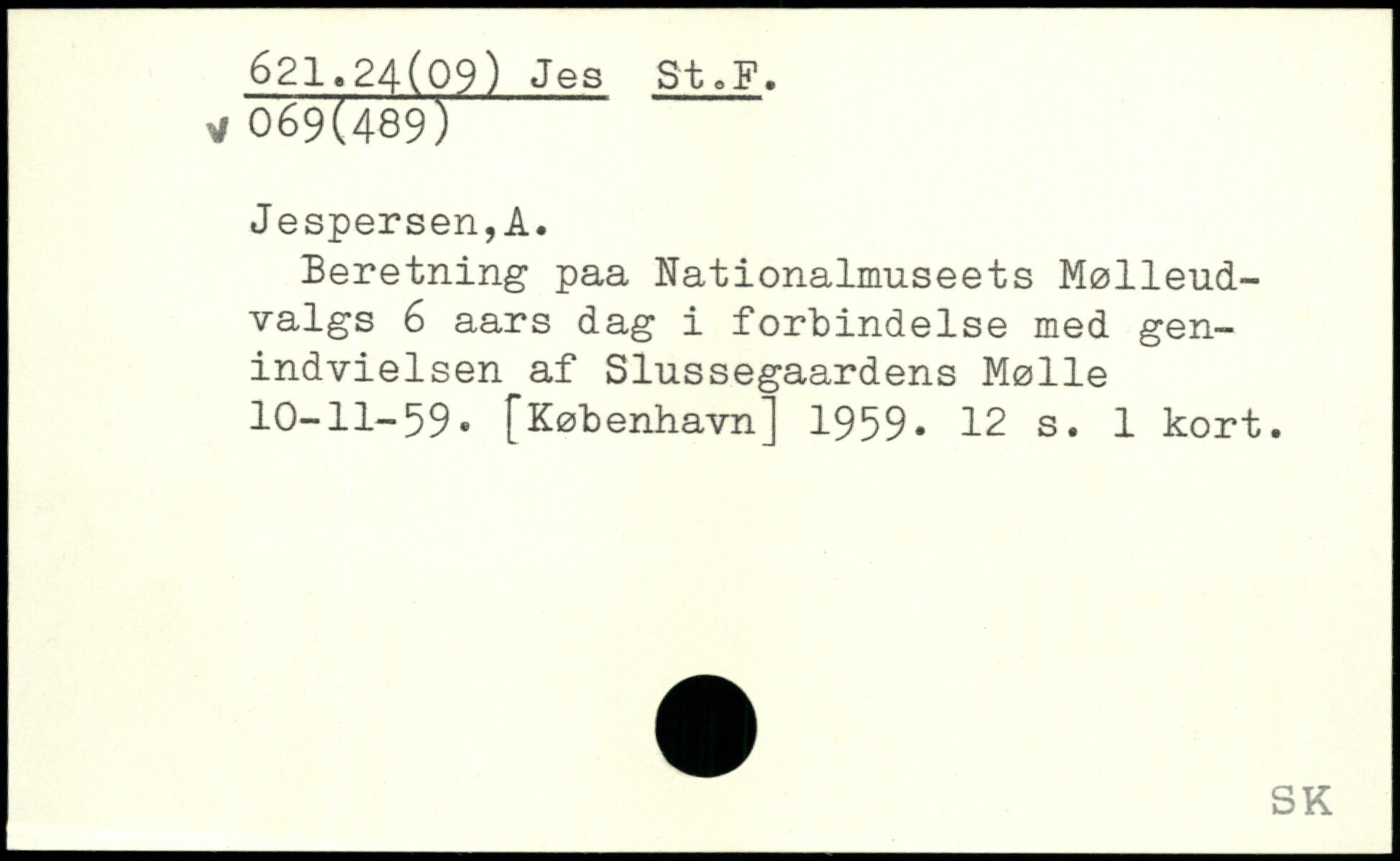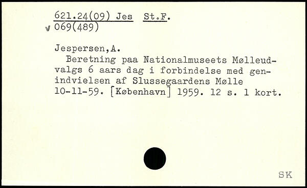 Beretning paa Nationalmuseets Mølleudvalgs 6 aars dag i forbindelse med genindvielsen af Slussegaardens Mølle 10-11-59.