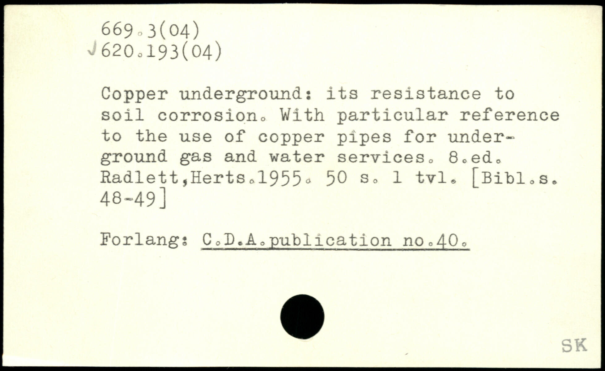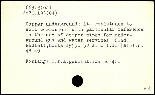 Copper underground: its resistance to soil corrosion, With particular reference to the use of copper pipes for underground gas and water services, 8<>ed0 Radlett ,Herts01955<>
