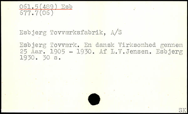 Esbjerg Tovværksfabrik, A/S Esbjerg Tovværk. En dansk Virksomhed gennem 25 Aar. 1905 - 1930. Af L.V.Jensen. Esbjerg 1930.