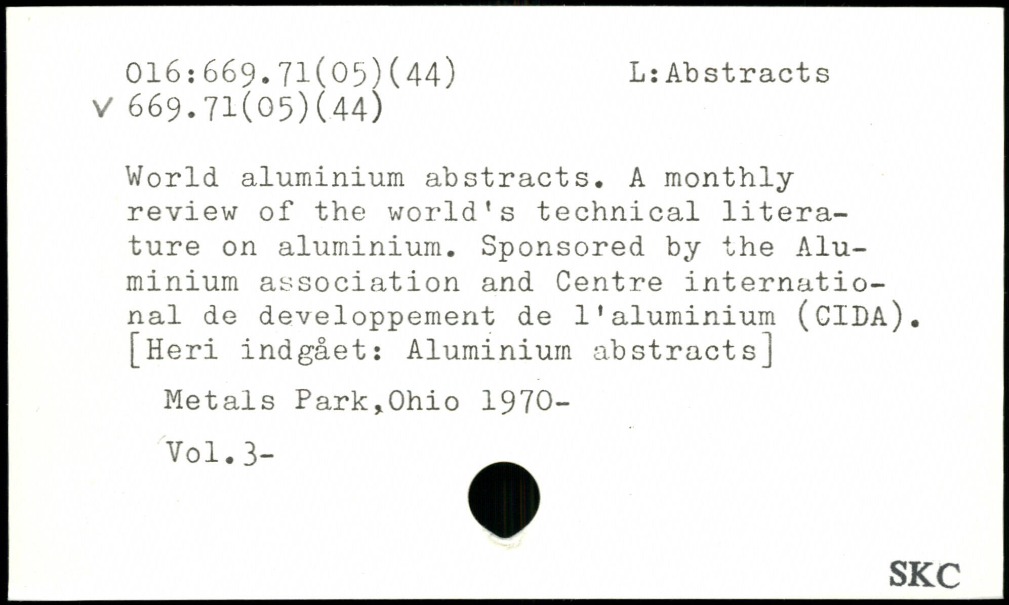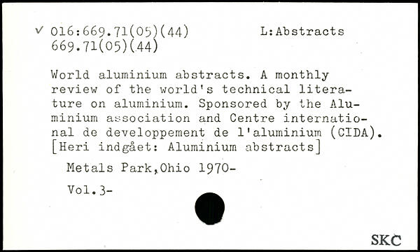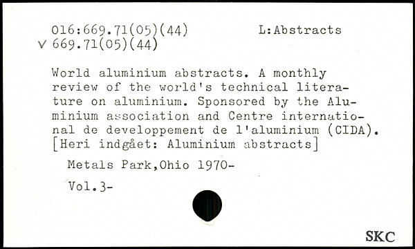 World aluminium abstracts. A monthly review of the world's technical literature on aluminium. Sponsored by the Aluminium association and Centre international de développement de l’aluminium (CIDA). [Heri indgået: Aluminium abstracts] Metals Park,Ohio 1970-