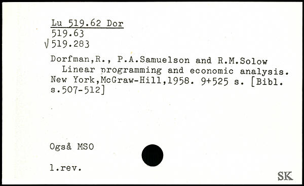 Dorfman,R., P.A.Samuelson and R.M.Solow Linear nrogramming and economic analysis.