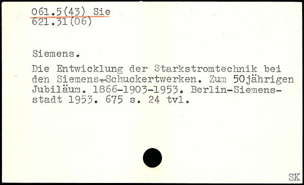 Die Entwicklung der Starkstromtechnik bei den Siemensrßchuckertwerken. Zum 50jährigen Jubiläum. 1866-1903-1953. Berlin-Siemensstadt 1953.