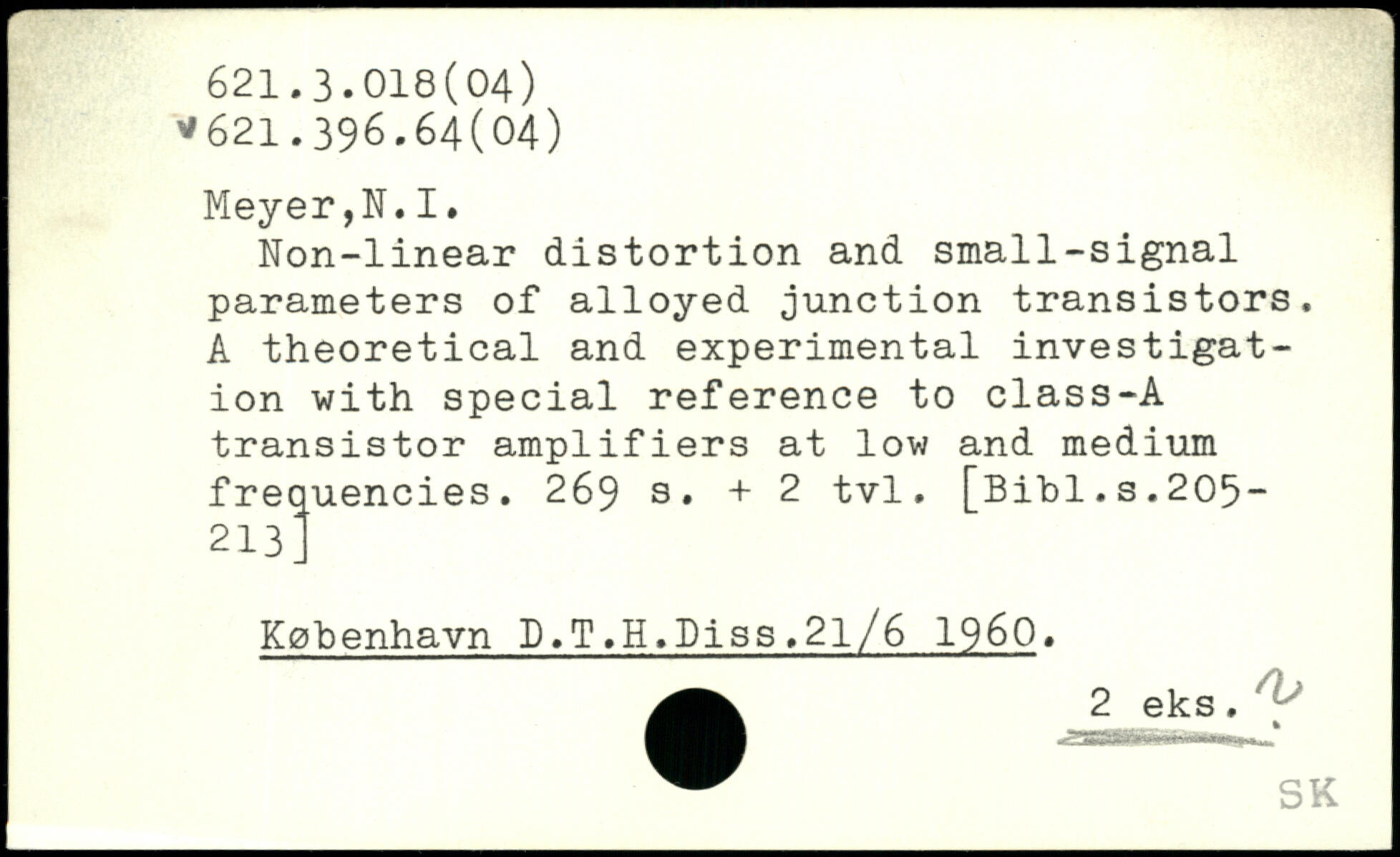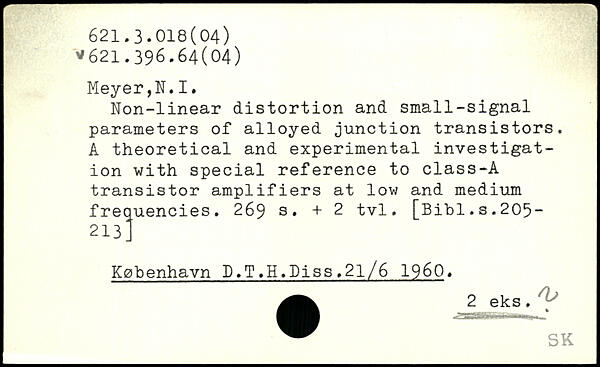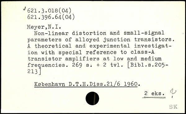 Non-linear distortion and small-signal parameters of alloyed junction transistors. A theoretical and experimental investigation with special reference to class-A transistor amplifiers at low and medium frequencies.