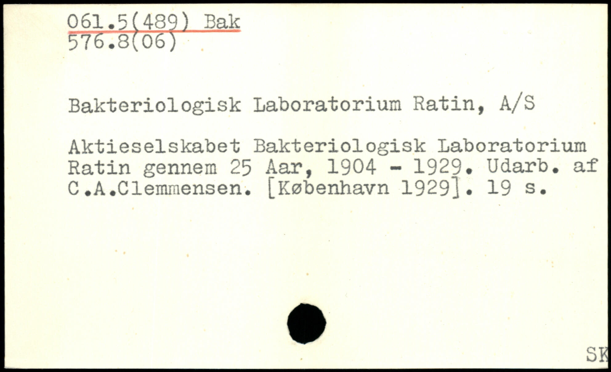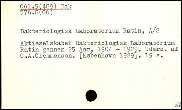 Bakteriologisk Laboratorium Ratin, A/S Aktieselskabet Bakteriologisk Laboratorium Ratin gennem 25 Aar, 1904 - 1929. Udarb. af C.A.Clemmensen.
