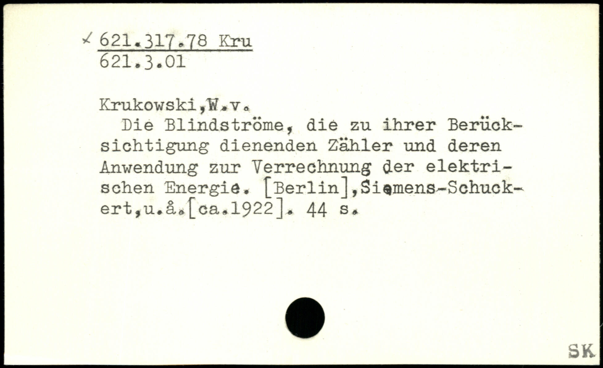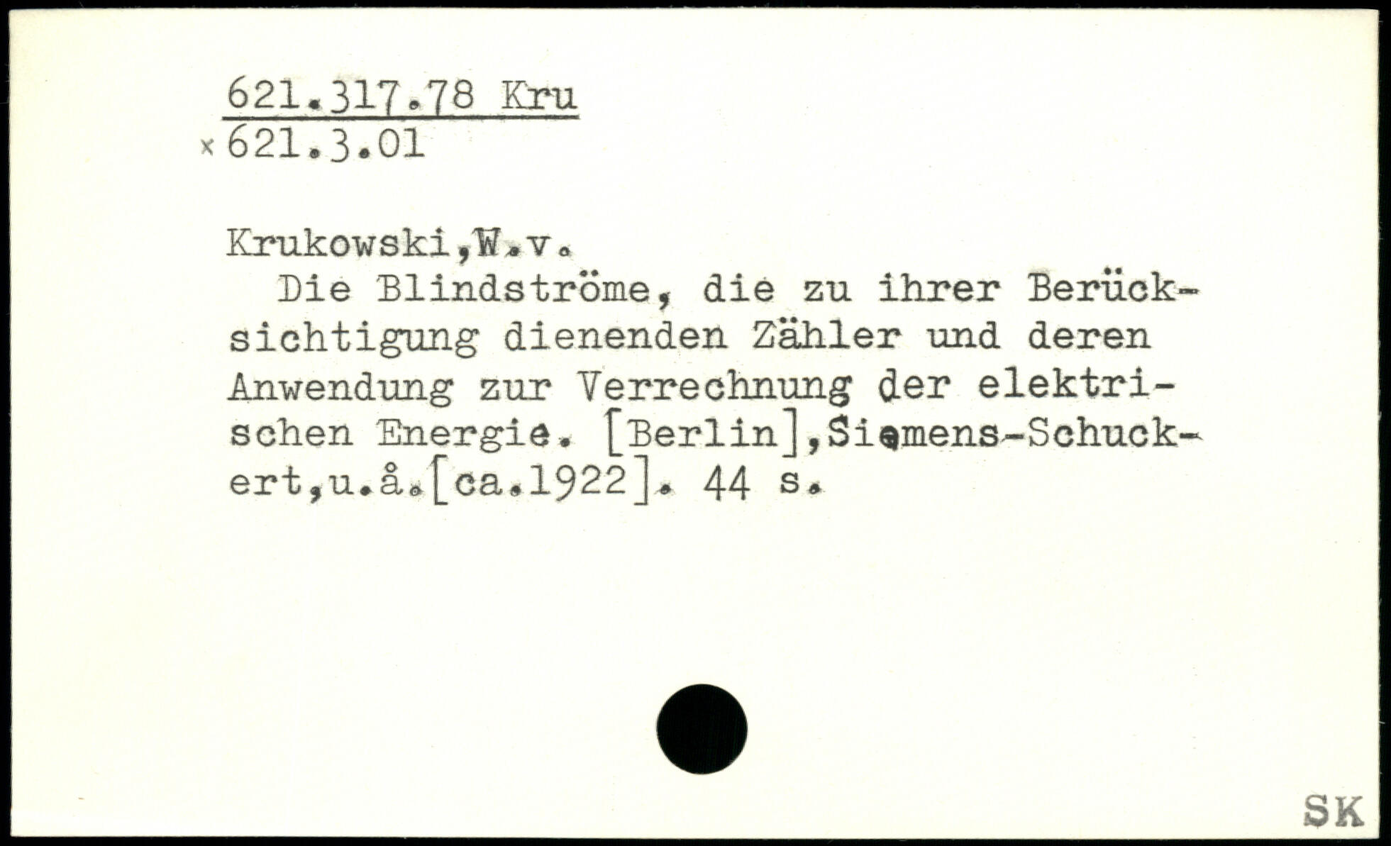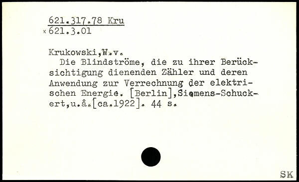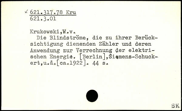 Die Blindströme, die zu ihrer Berücksichtigung dienenden Zähler und deren Anwendung zur Verrechnung der elektrischen Energie. [Berlin] ,Siemens--Schuck-ert,u.a.[ca.1922].