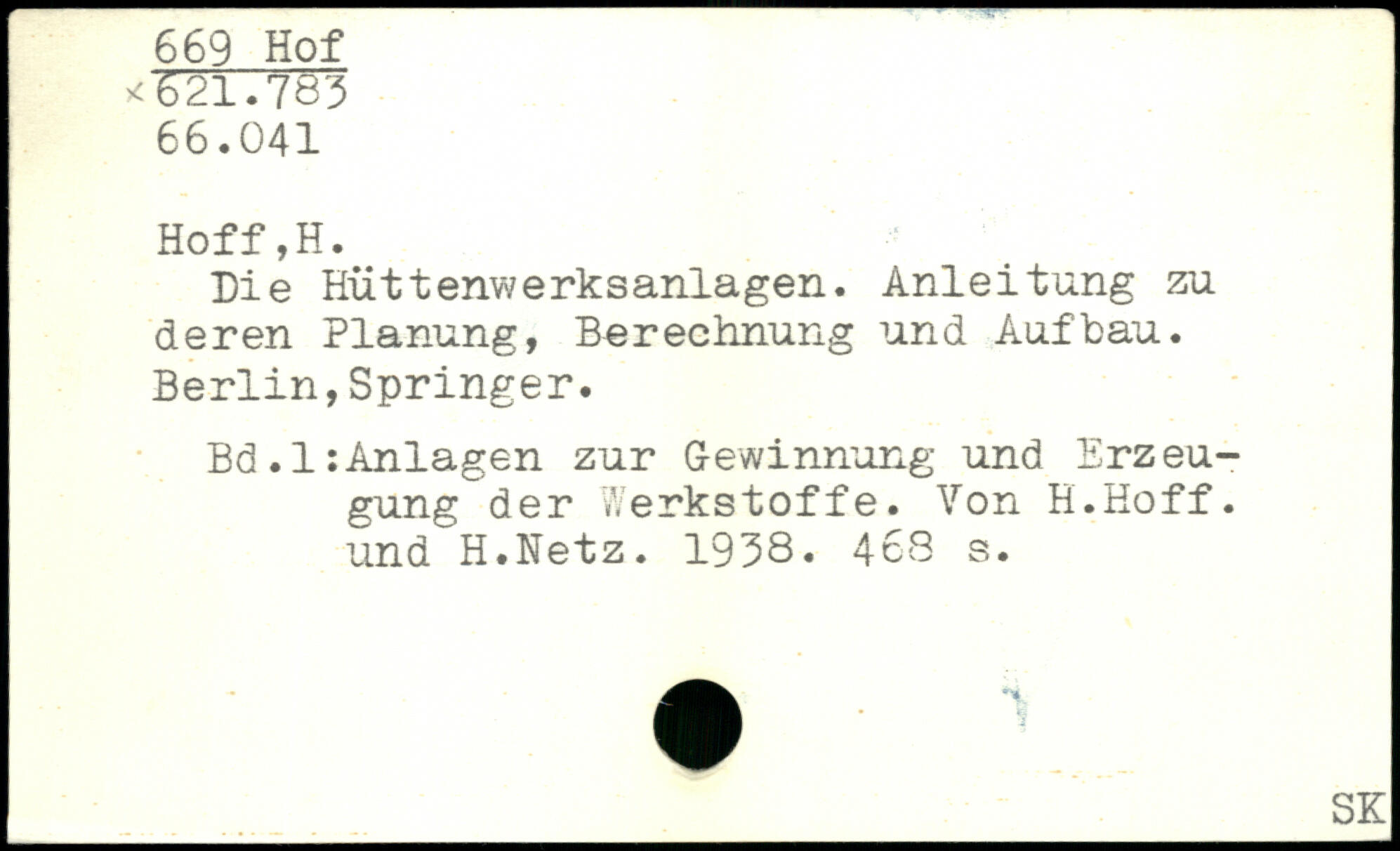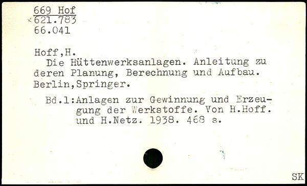 Die Hiittenwerksanlagen. Anleitung zu deren Planung, Berechnung und Aufbau. Berlin,Springer. Bd.l:Anlagen zur Gewinnung und Erzeugung der Werkstoffe. Von H.Hoff. und H.Netz. 1938.