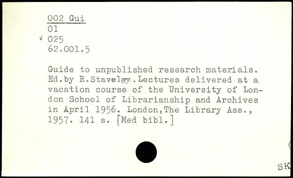 Guide to unpublished research materials. Ed,by R.Stavelgy. Lectures delivered at a vacation course of the University of London School of Librarianship and Archives in April 1956. London?The Library Ass,, 1957. HI s. [Med bibl. ]