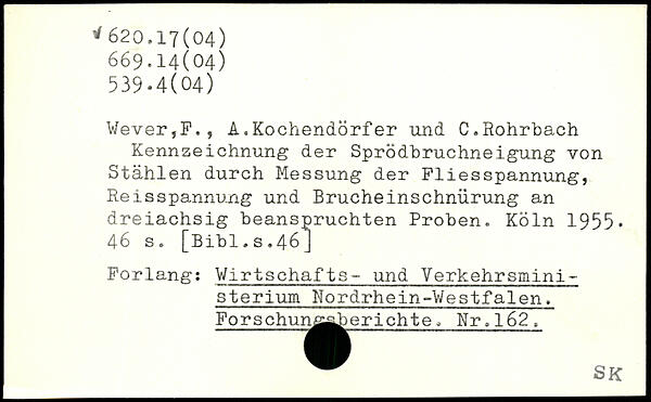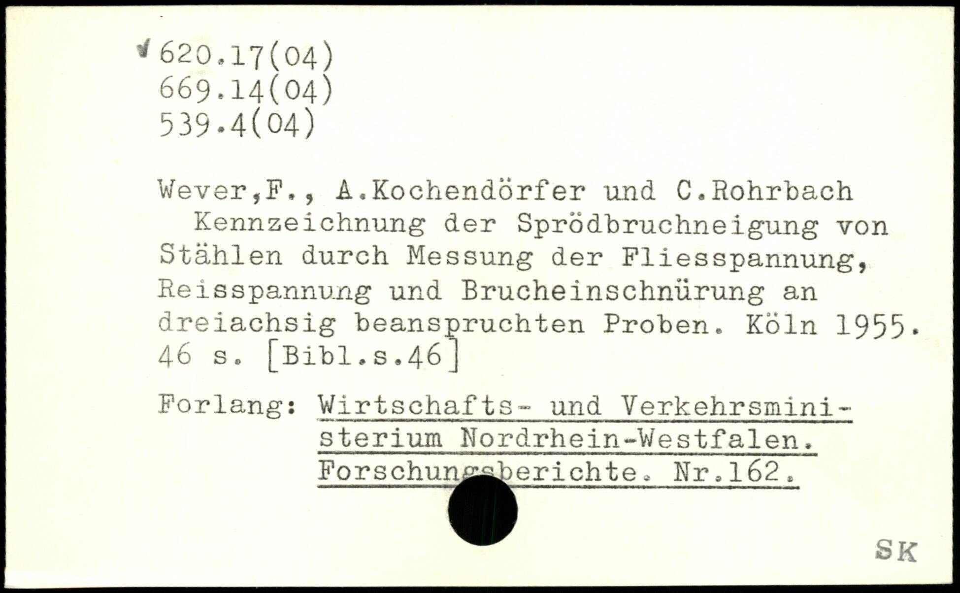 Wever,F,, A.Kochendörfer und C.Rohrbach Kennzeichnung der Sprödbruchneigung von Stählen durch Messung der FliesSpannung, Re is Spannung und Bruche inschniirung an dreiachsig beanspruchten Proben.