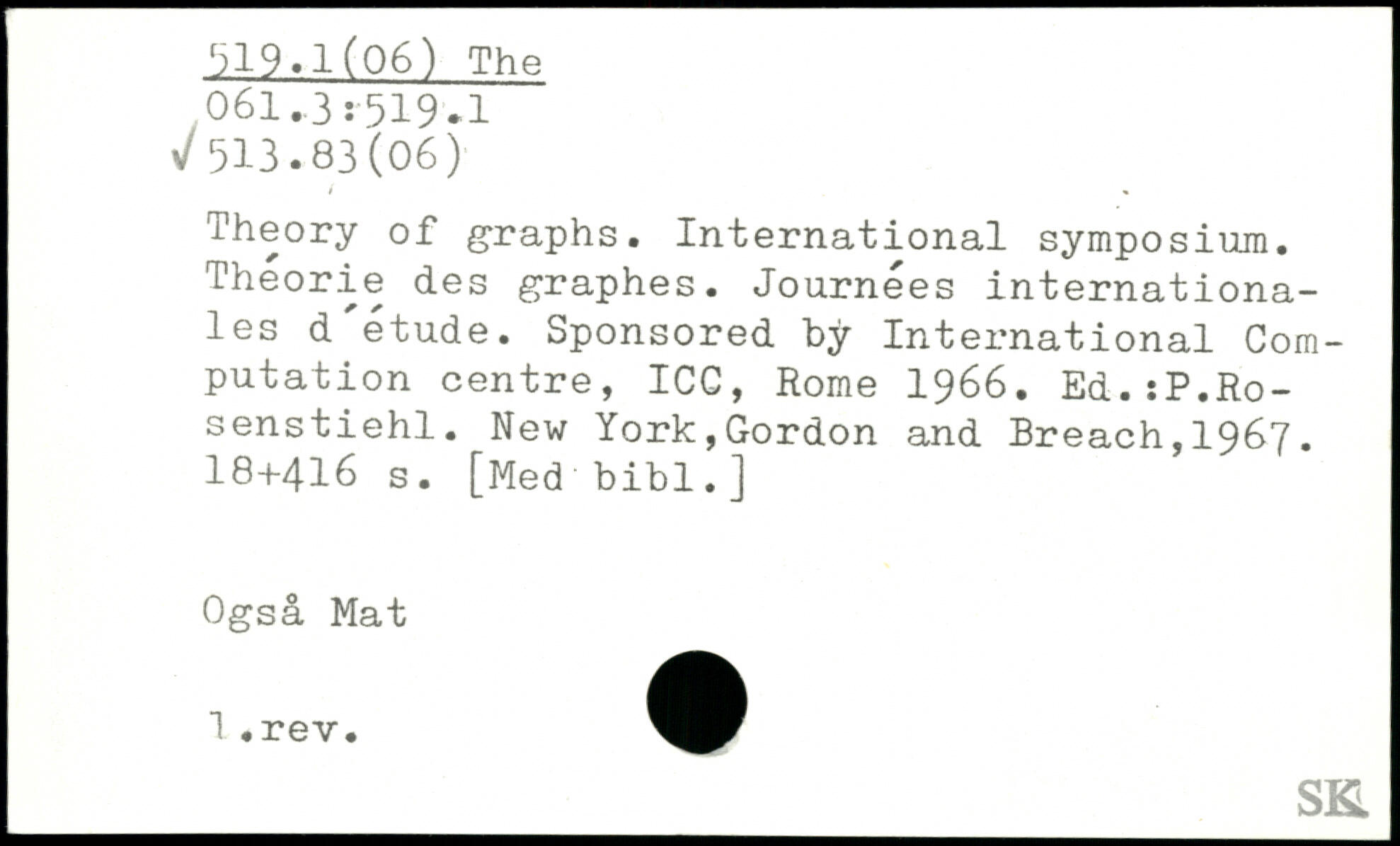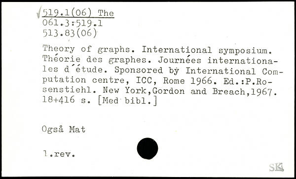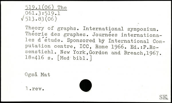 Theory of graphs. International symposium. Théorie des graphes. Journées internationales d'étude. Sponsored bÿ International Computation centre, ICC, Rome 1966. Ed.îP.Ro-senstiehl.