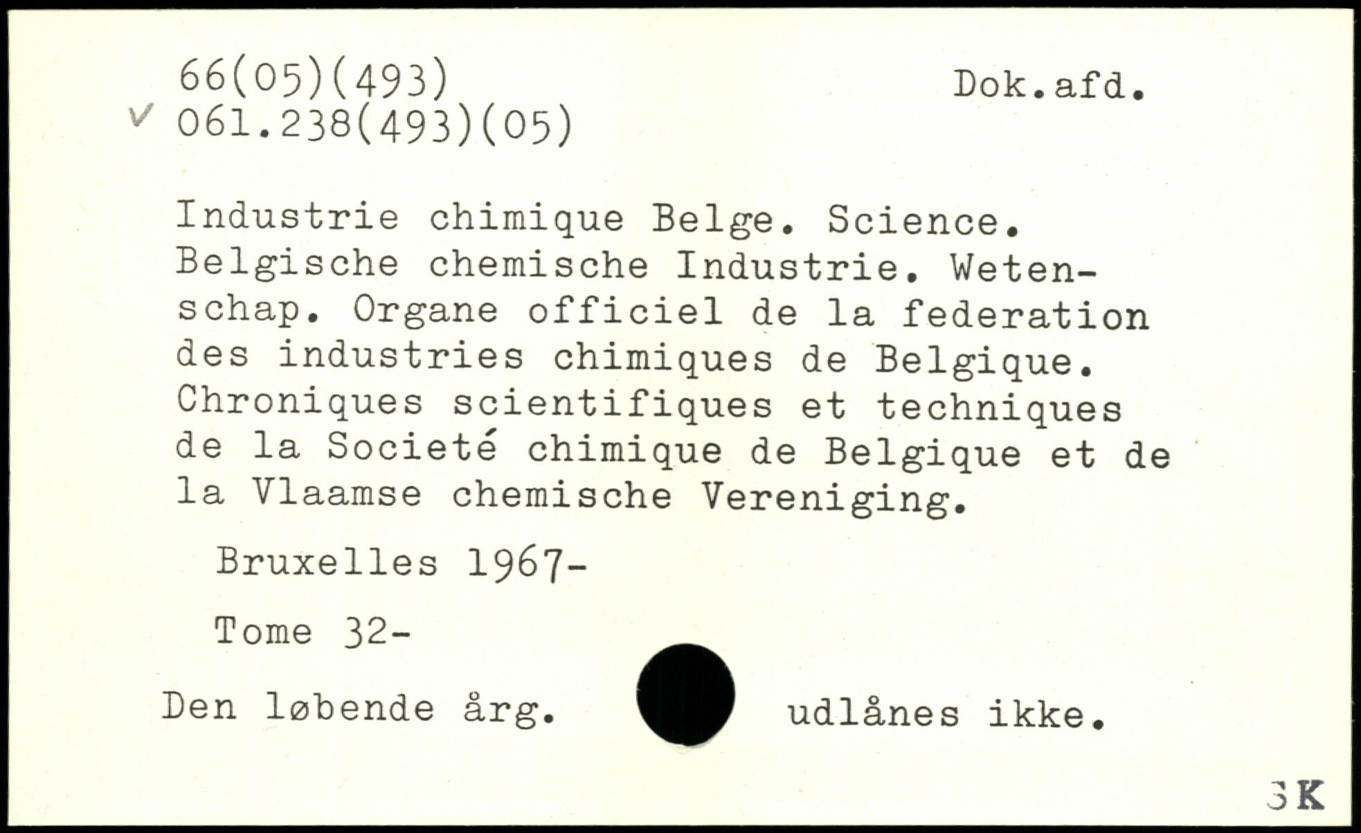 Industrie chimique Belge. Science. Belgische chemische Industrie. Weten-schap. Organe officiel de la federation des industries chimiques de Belgique. Chroniques scientifiques et techniques de la Société chimique de Belgique et de la Vlaamse chemische Vereniging.